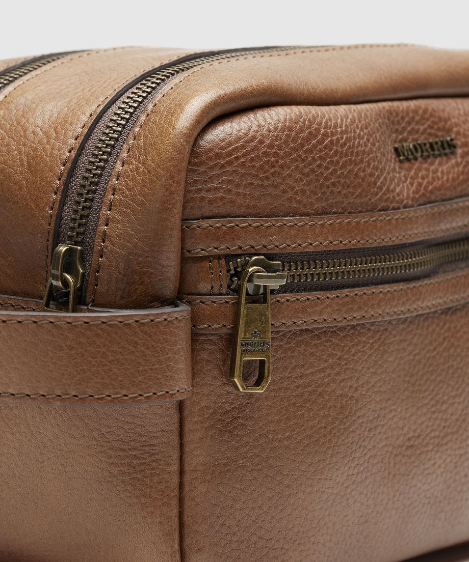 Bag in leather. The outside has a pocket that is closed with a zipper and the inside consists of two white compartments. Width 24 cm, Height 15 cm, Depth 12 cm100% leather