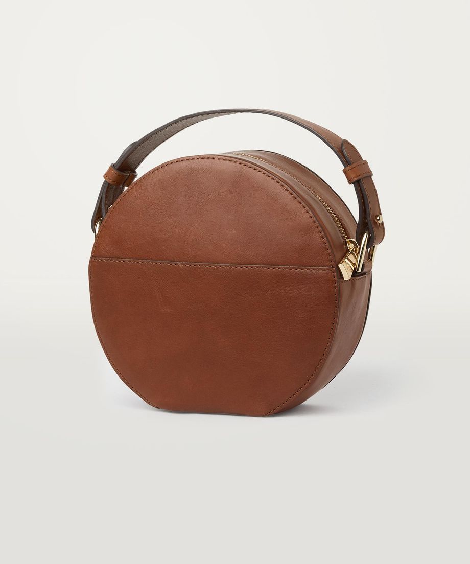 Round crossbody bag in leather.that has a pocket placed on the frontside of the bag. Closes with metal zipper. The bag has an adjustable and removable shoulder strap in leather. logo in metal100% Cow leatherSize of the bag: width 20 cm, height 19 cm, depth 7 cm