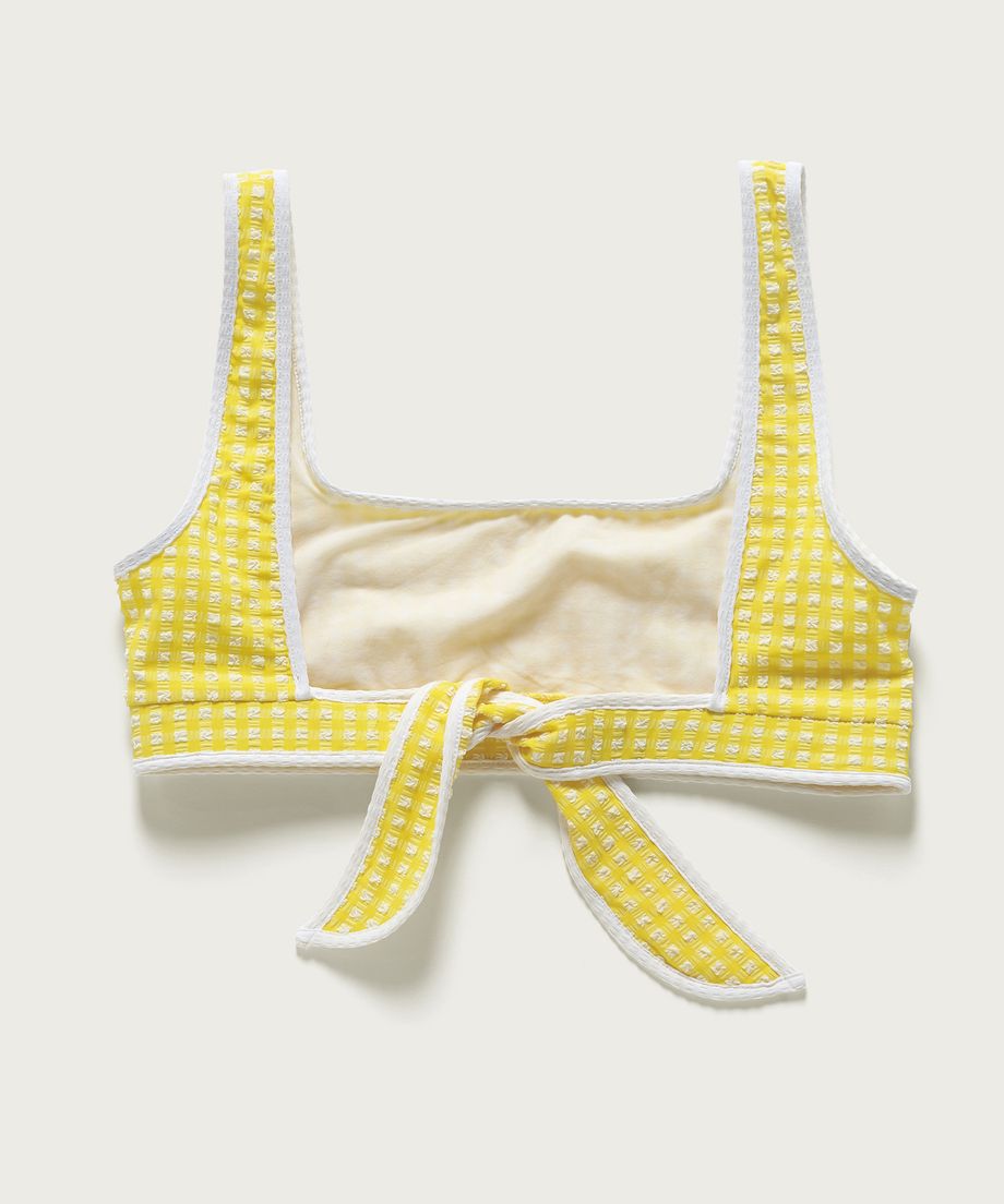 Lady bikini top in a gingham checked fabric with structure. The bikini top has a flattering square shape neckline and an open back, where the top ties. Decorative piping bounded edges. Normal fitmetal charm in gold metal placed at bottom hem85% Polyamide, 15% ElastaneMachine wash 30 degreesYou find the matching bikini briefs here: Esther Bikini Briefs