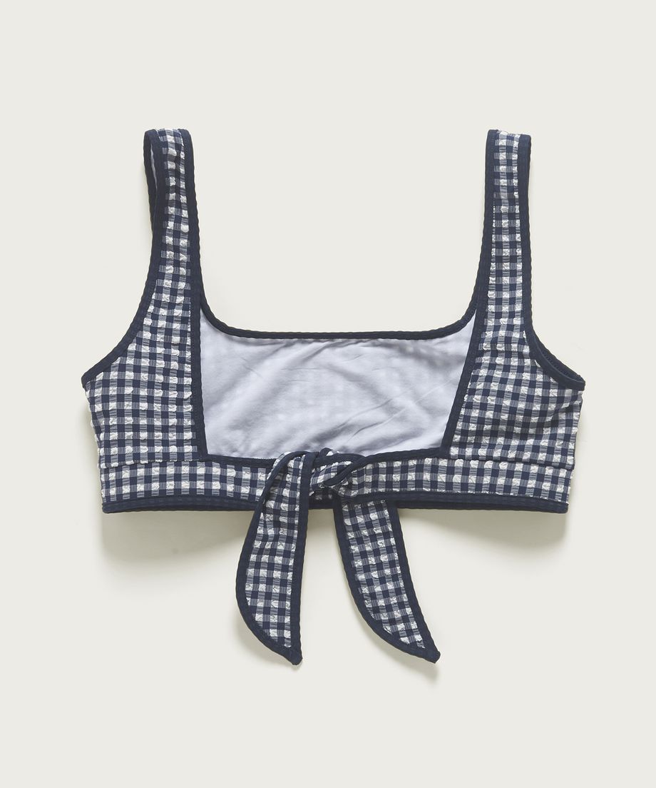 Lady bikini top in a gingham checked fabric with structure. The bikini top has a flattering square shape neckline and an open back, where the top ties. Decorative piping bounded edges. Normal fitmetal charm in gold metal placed at bottom hem85% Polyamide, 15% ElastaneMachine wash 30 degreesYou find the matching bikini briefs here: Esther Bikini Briefs