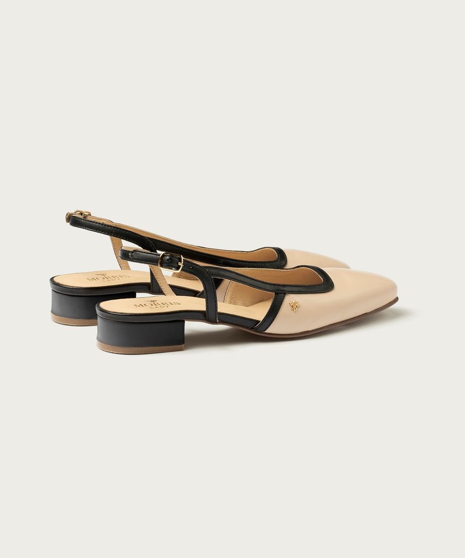 Lady shoe in leather with covered toe, high heel and sling back. The toe and opening have an elegant squared shape. Closes with a small buckle in gold metal. Wear the shoe with jeans for a feminine look and to all spring and summer dresses. Height of the heel 35 mmCovered heel in leather. Decorative lily in gold metal placed at the outer side of the shoe100% Leather