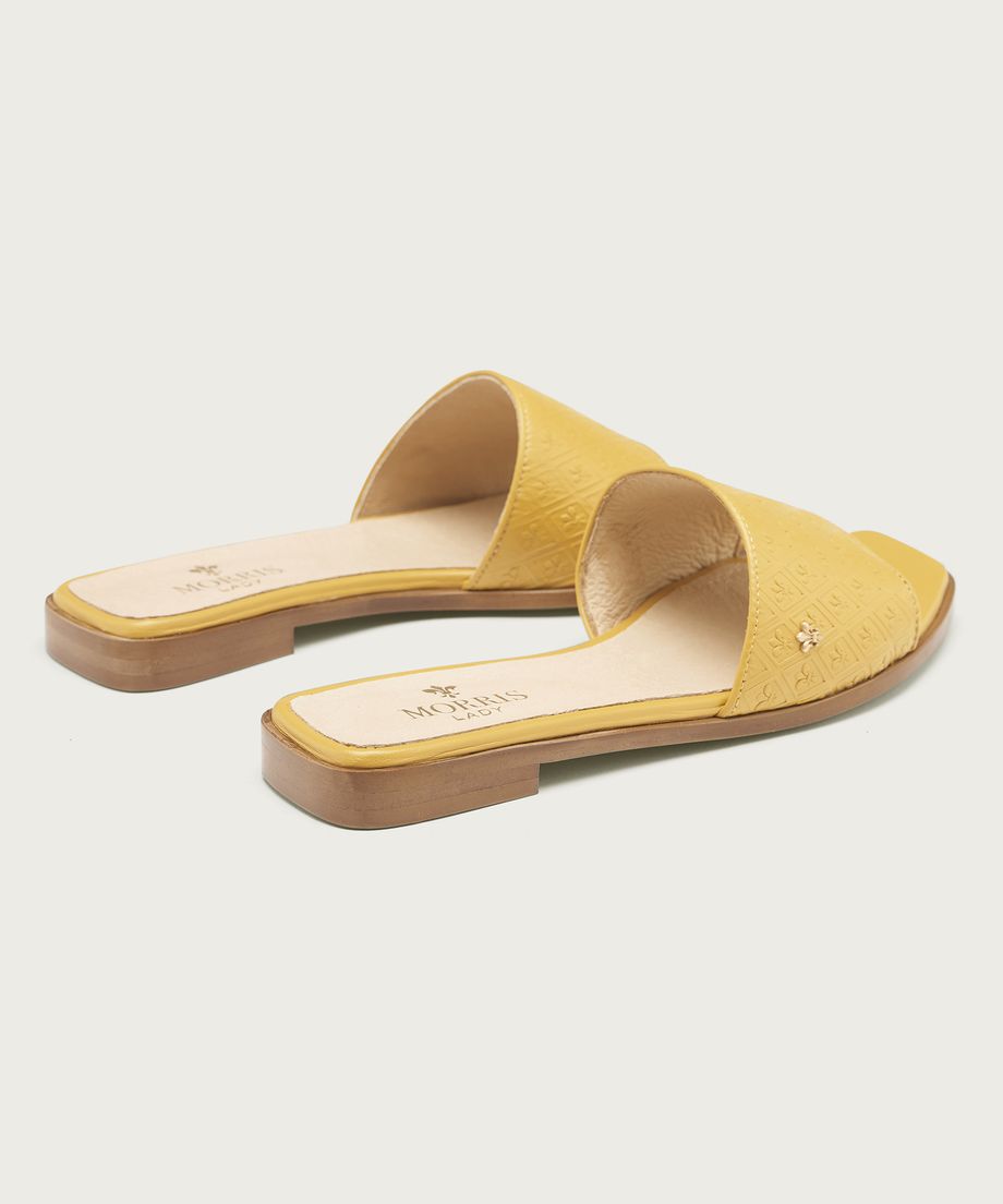 Timeless flat sandal with open toe. The upper part of the sandal has a decorative debossed lily pattern. Height of the heel 22 mm. Decorative lily in gold metal placed at the outer side of the shoe100% Leather