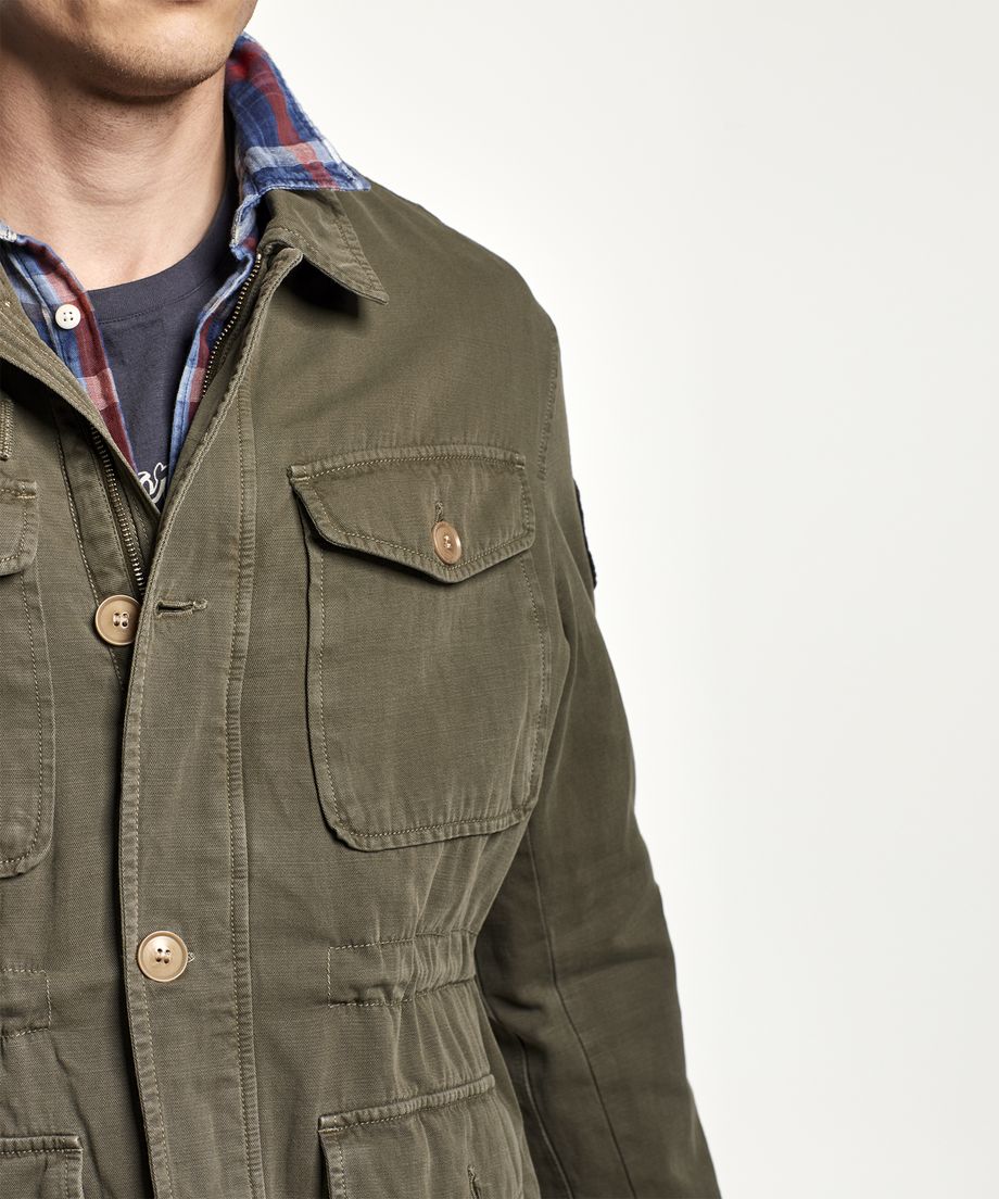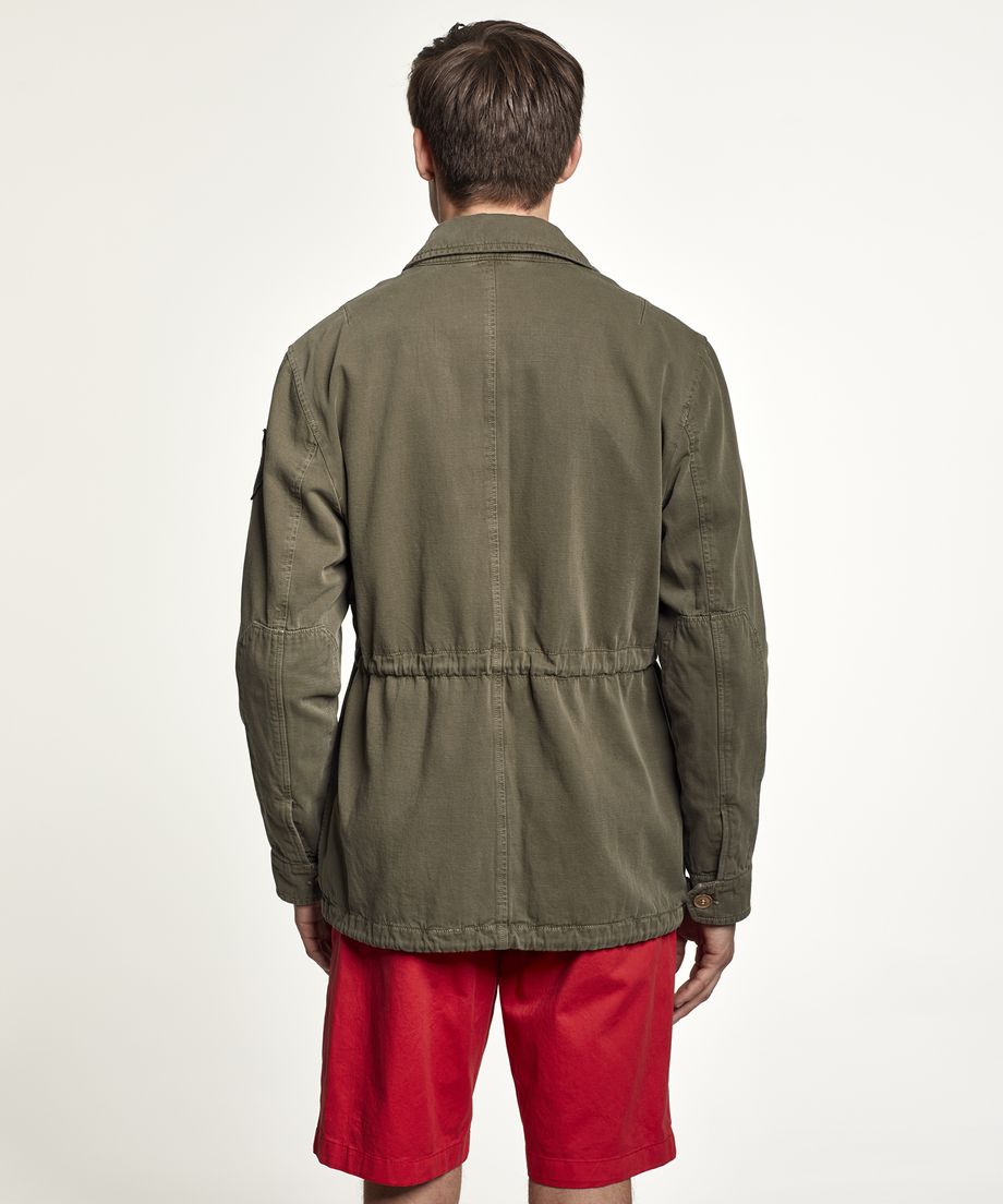 Jacket with utility influences made of a broken cotton and linen twill from Textil Santanderina. The fabric has a soft and light handfeel. The jacket has two patched chest pockets and two larger pockets with laps and button closure, characteristic for this style of jacket. Closes with a two-way metal zipper and placket with buttons at front. Waist adjustment with a drawstring placed inside the jacket. Two interior pockets. Cuff with two buttons. Normal fit. Unlined patch placed above right chest pocketShell fabric: 80% Cotton, 20% Linen. Machine wash 30 degrees