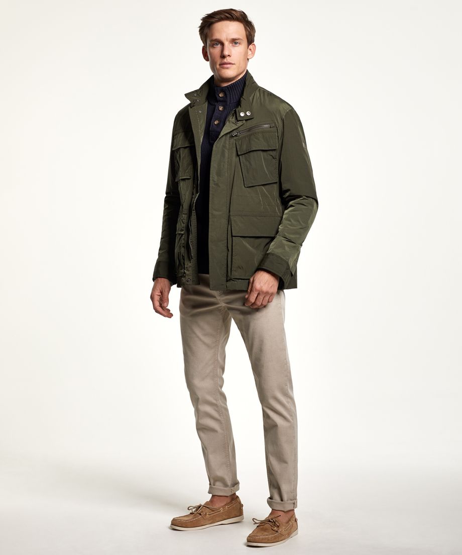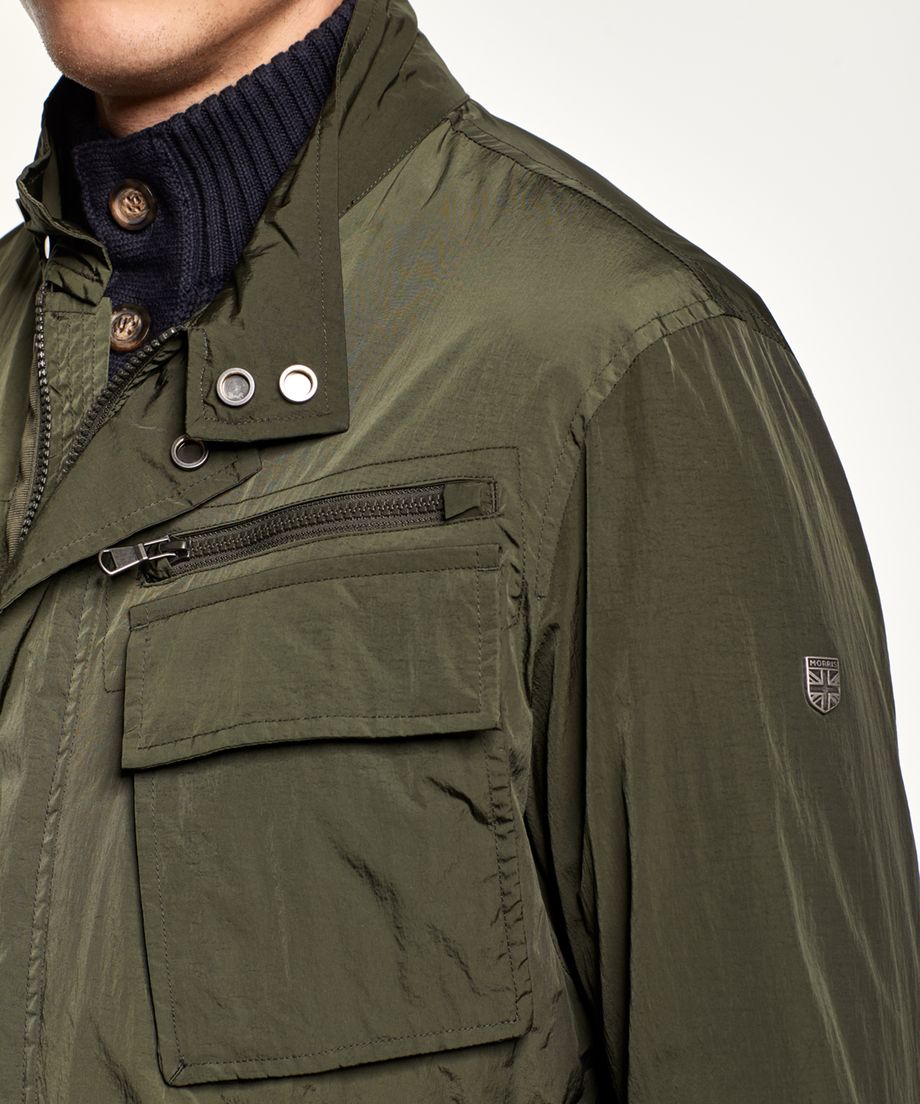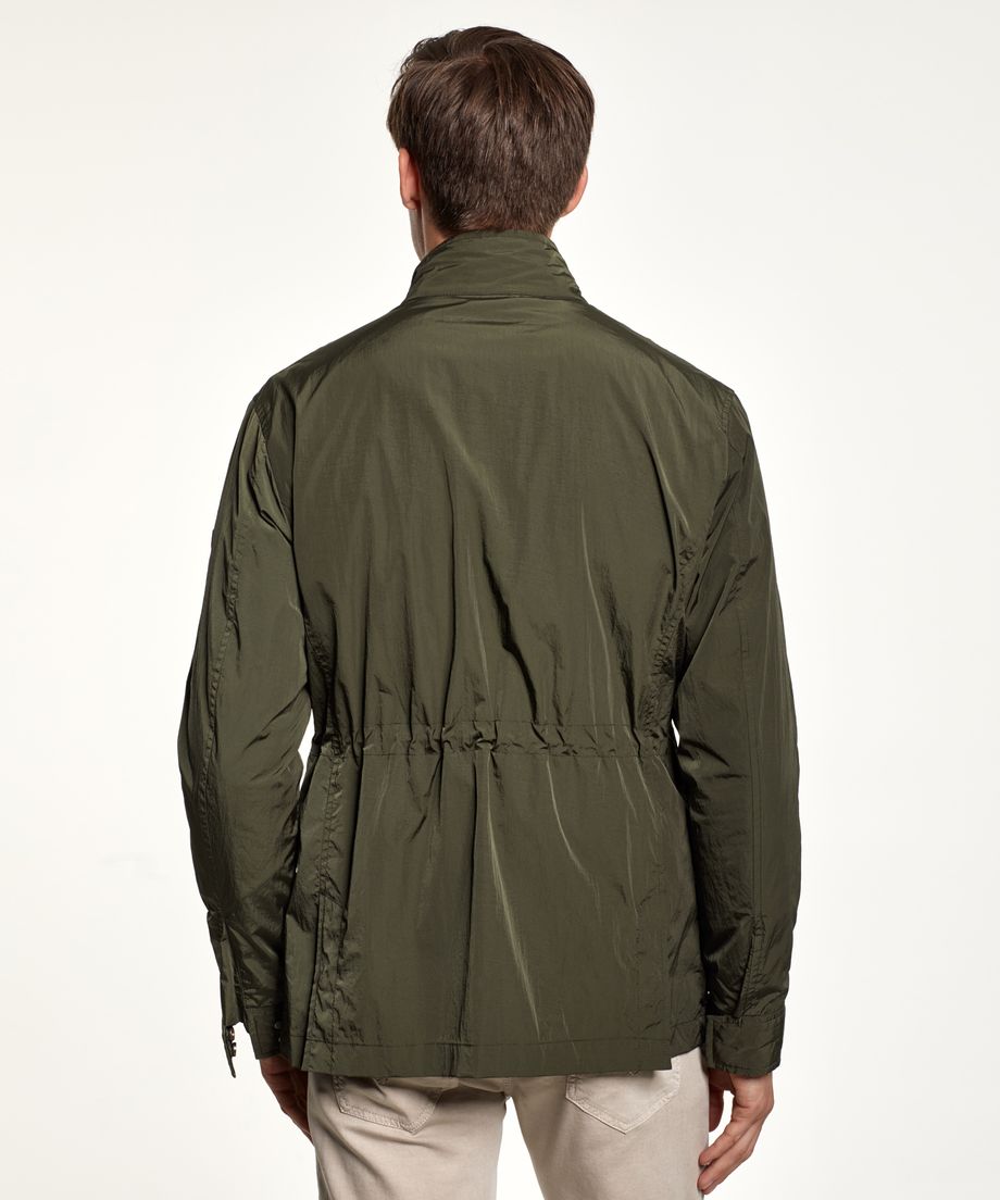 Field jacket in a classic 4-pocket style. The jacket has a wind- and water-repellent shell fabric and can be worn in light rain. Closes with a two-way metal zipper. Waist adjustment with elastic cord inside the jacket. One hidden chest pocket with zipper and one larger pocket are placed inside the jacket. Normal fit. Metal patch placed at left bicepSide vents at backShell fabric: 100% NylonLining: 100% NylonMachine wash 40 degrees