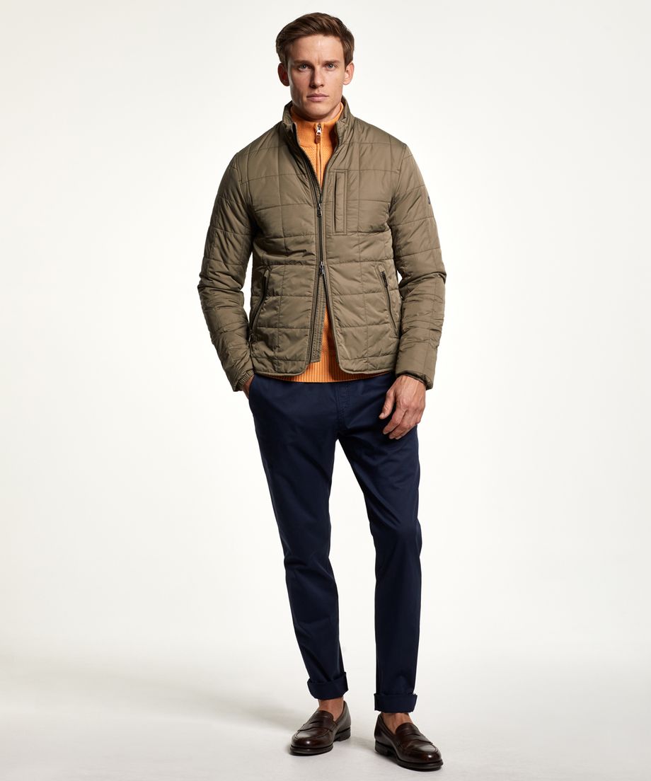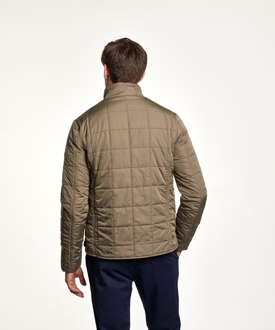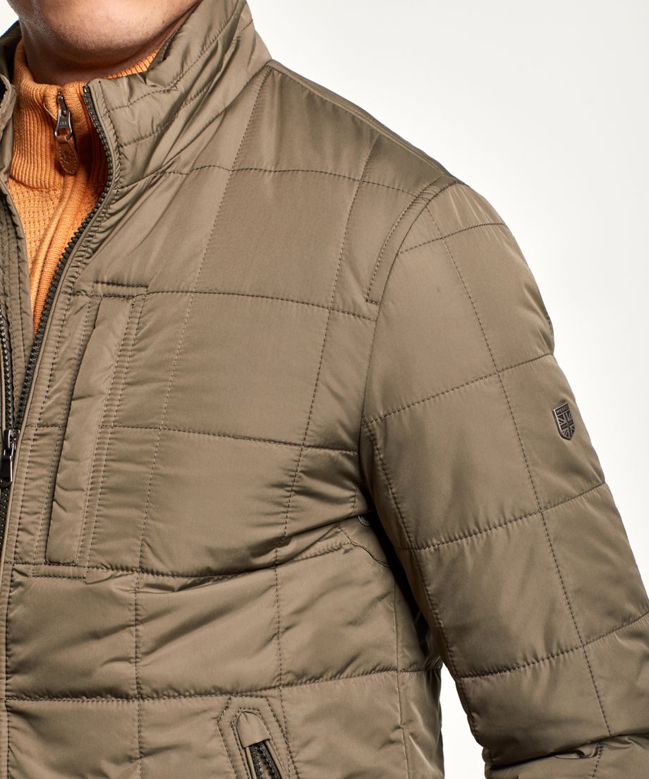 Quilted jacket with squared shaped quilting. Closes with a two-way vislon zipper. The jacket has one chest pocket and two slanted front pockets, all closes with vislon zippers. Inside of cuff a hidden elastic is placed to comfortably place the cuff. One hidden chest pocket with zipper and one larger patch pocket are placed inside the jacket. Normal fit. Metal patch placed at left bicepShell fabric: 100% PolyesterLining: 100% PolyesterPadding: 100% PolyesterMachine wash 40 degrees. The model is 184 cm and wears size M.