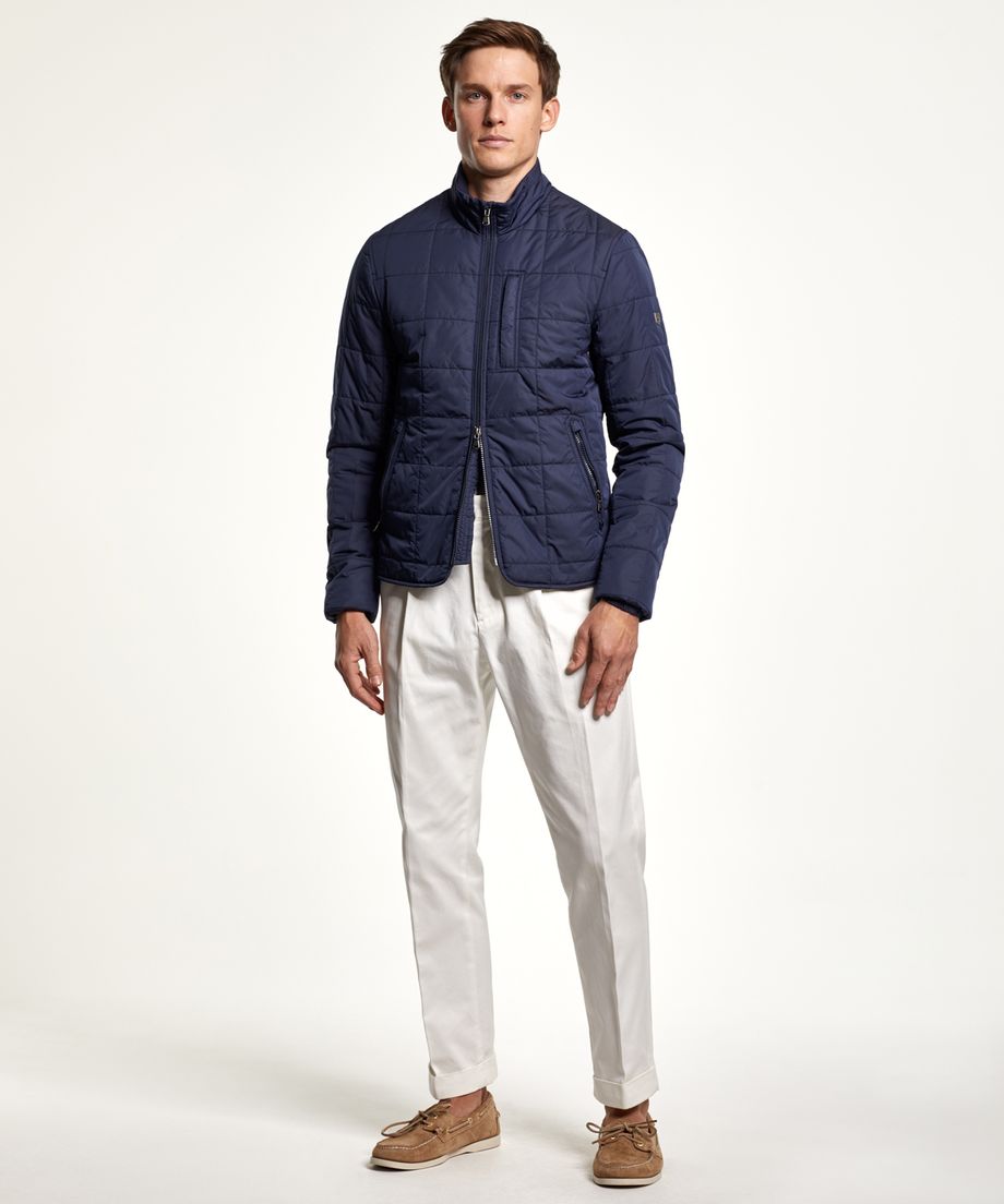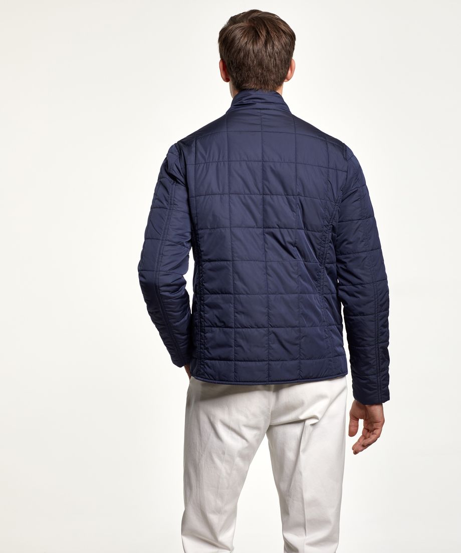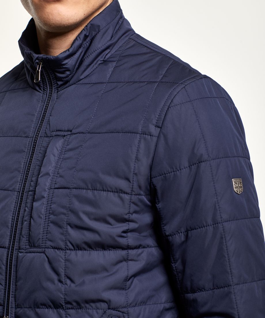 Quilted jacket with squared shaped quilting. Closes with a two-way vislon zipper. The jacket has one chest pocket and two slanted front pockets, all closes with vislon zippers. Inside of cuff a hidden elastic is placed to comfortably place the cuff. One hidden chest pocket with zipper and one larger patch pocket are placed inside the jacket. Normal fit. Metal patch placed at left bicepShell fabric: 100% PolyesterLining: 100% PolyesterPadding: 100% PolyesterMachine wash 40 degrees. The model is 184 cm and wears size M.