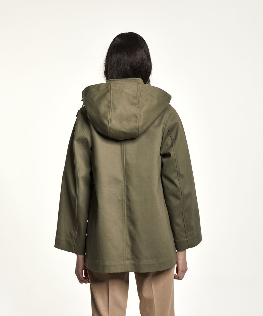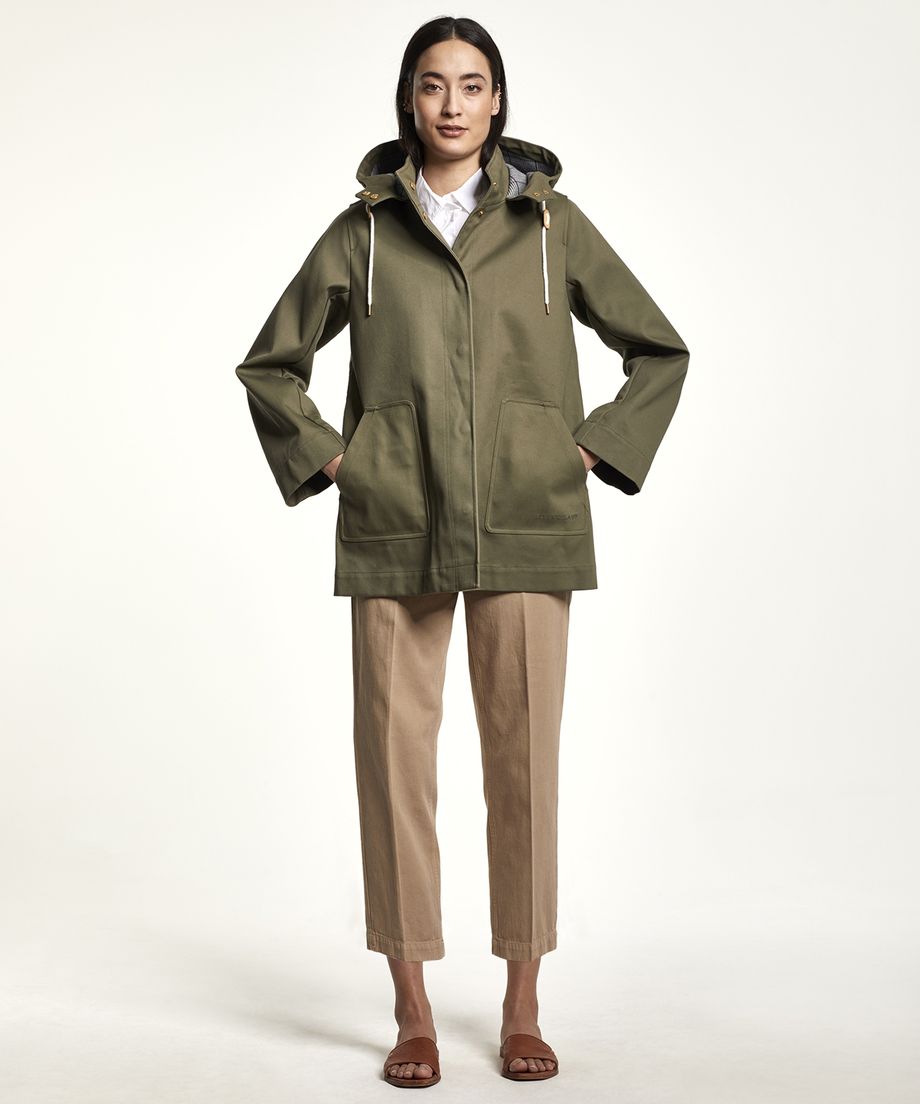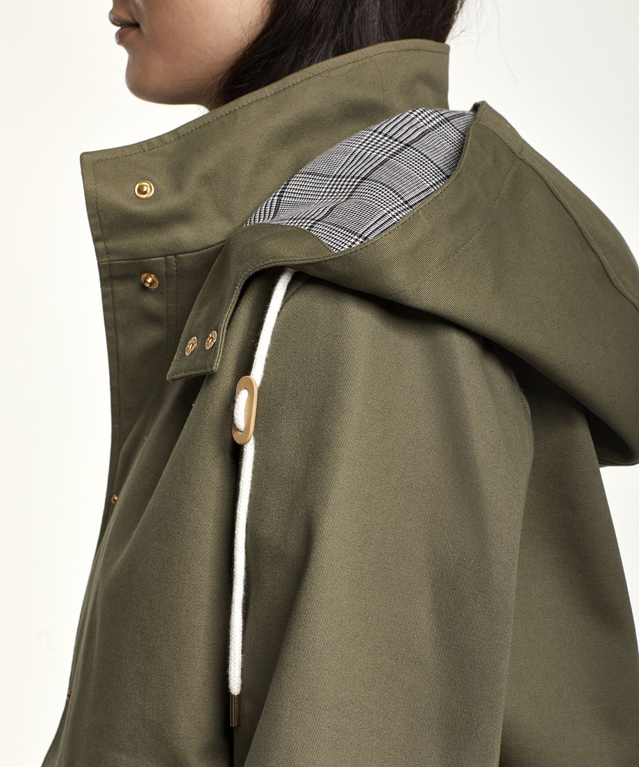 Weatherproof parka with hood, made of a bonded cotton fabric with a checked inside. The parka has a slight A-line shape and wide sleeve that can be worn turned up to show the fine inside. The parka closes with hidden press buttons. Large patched pockets are placed on the outside and on pocket on the inside. Embroidered logo at pocket.The hood isn't removable100% CottonMachine wash 30 degrees. The model is 180 cm and wears size S.