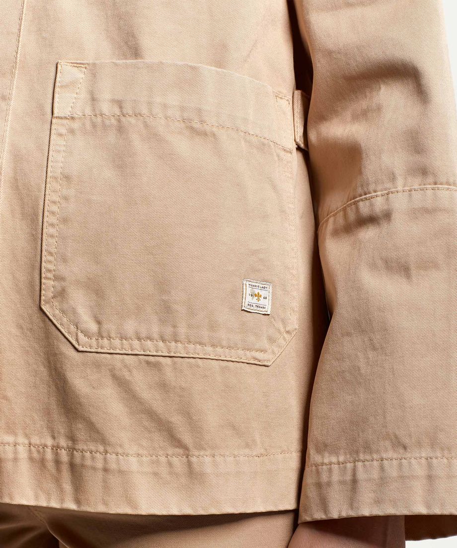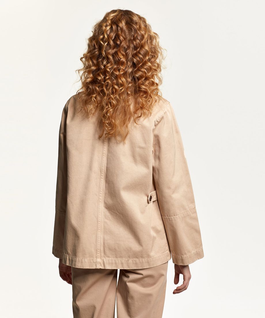 A-line shaped jacket in midi length with inspiration from French workwear. The waist width of the jacket can be adjusted with a strap, to get a more feminine look. The jacket has button closure at front. Style the jacket with a turned-up sleeve and a longer decorative sleeve underneath. The jacket is made of a heavy cotton quality and is garment dyed to create a unique and washed look. Normal fitDecorative woven label at left pocket100% CottonMachine wash 30 degreesYou find the matching skirt here: Raphaelle Skirt