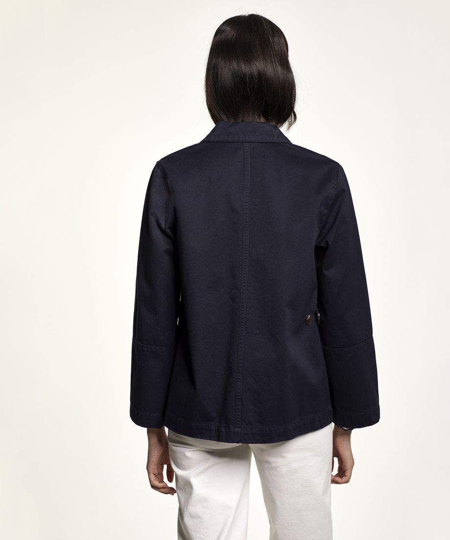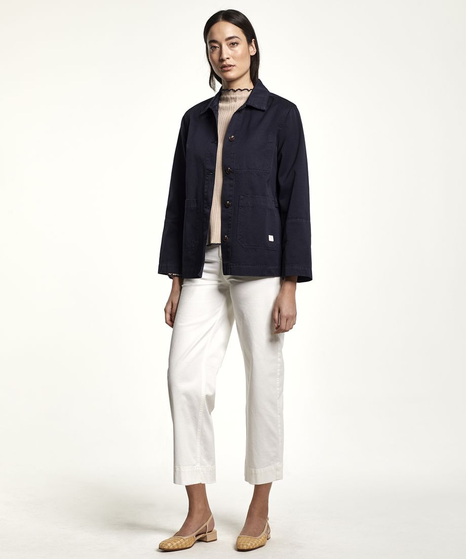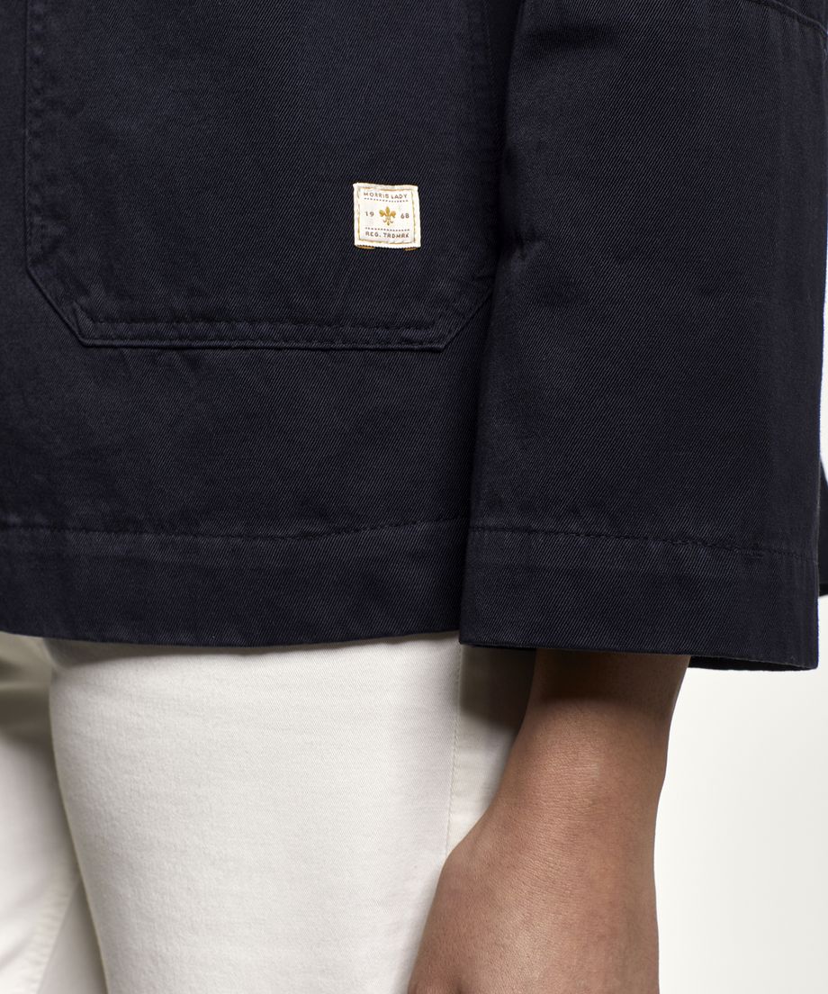 A-line shaped jacket in midi length with inspiration from French workwear. The waist width of the jacket can be adjusted with a strap, to get a more feminine look. The jacket has button closure at front. Style the jacket with a turned-up sleeve and a longer decorative sleeve underneath. The jacket is made of a heavy cotton quality and is garment dyed to create a unique and washed look. Normal fitDecorative woven label at left pocket100% CottonMachine wash 30 degreesYou find the matching skirt here: Raphaelle Skirt