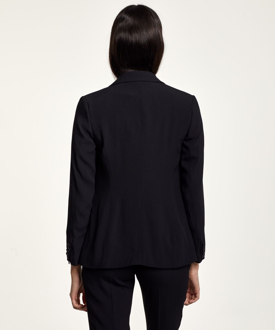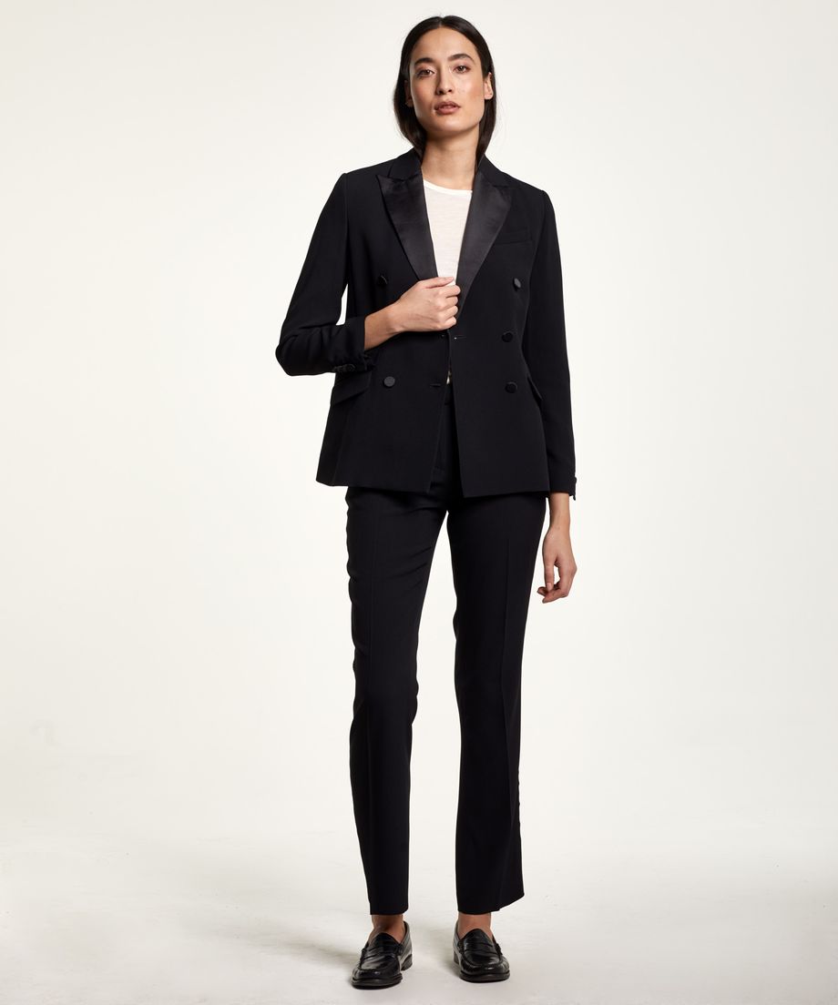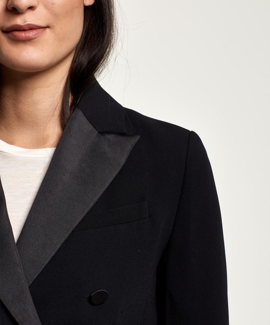 Double breasted smoking blazer with normal fit. Decorative contrast fabric at collar, lapels and buttons. The blazer has two flap pockets, one chest pocket and one interior pocket. Fully linedDouble side vents at backShell fabric: 78% Acetate, 22% ViscoseLining: 100% ViscoseDry cleaningThe model is 180 cm and wears size 36.