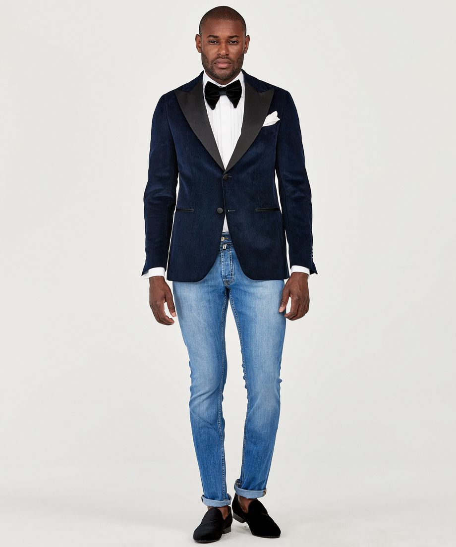 Premium Dinner Jacket, a single breasted jacket with two buttons and two slits. The jacket is half lined with two jetted front pockets in satin. The jacket also has a peak lapel in satin and satin covered buttons. 100% CottonLining 100% ViscoseDry CleanThe model is 183 cm and wears size M/50