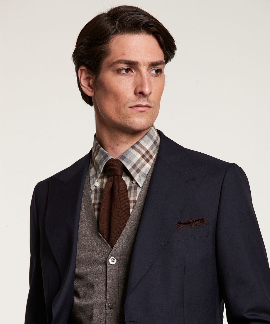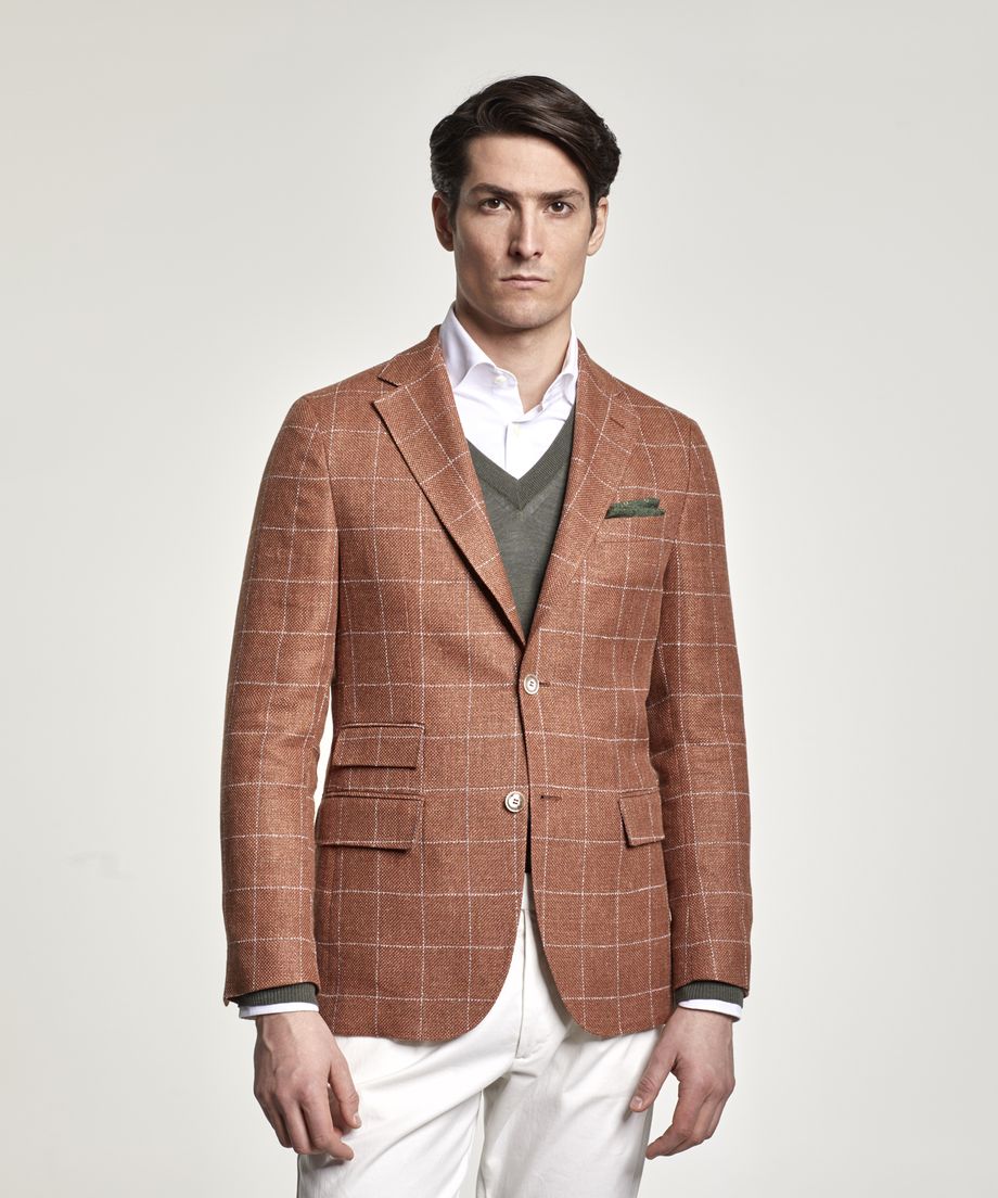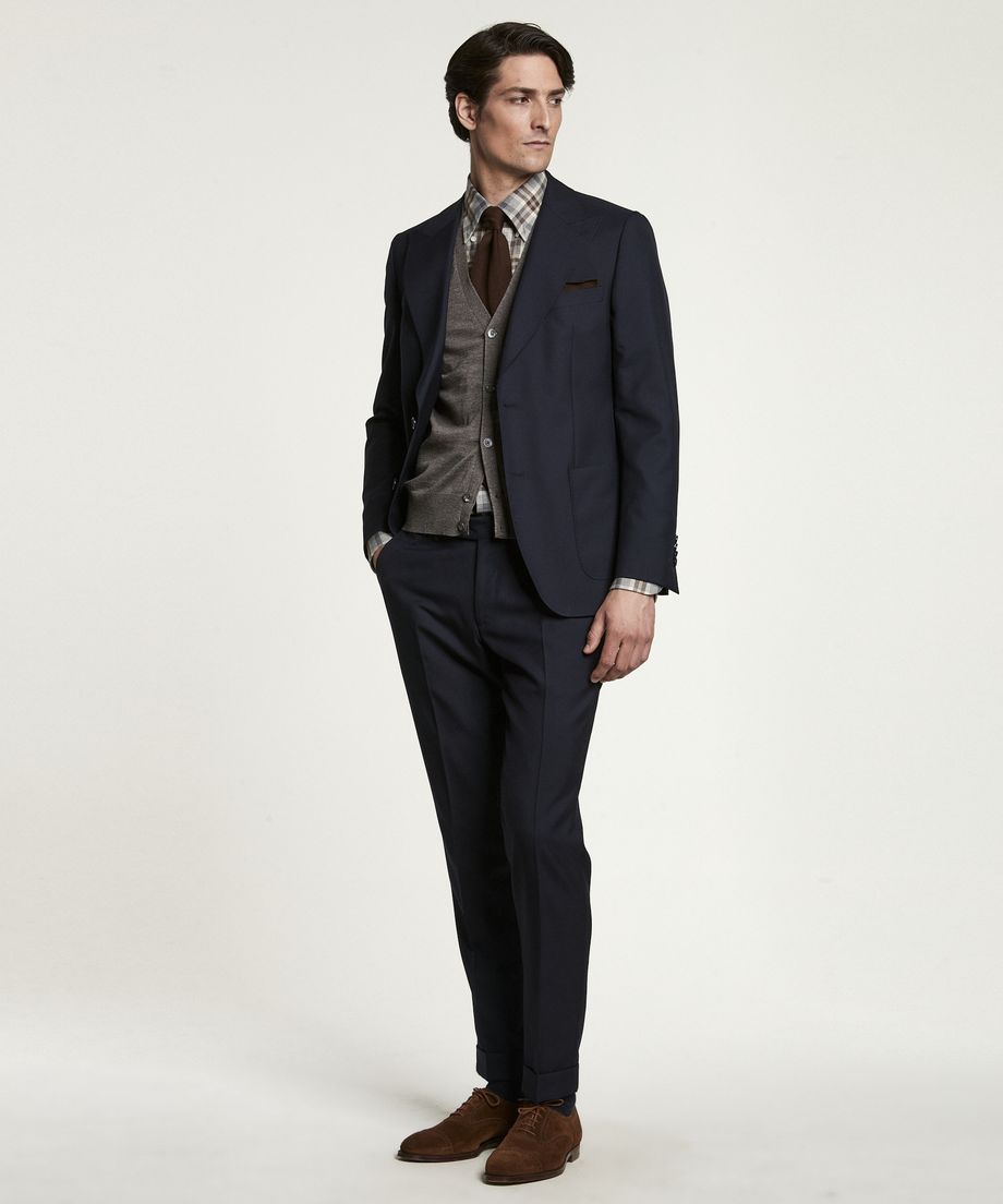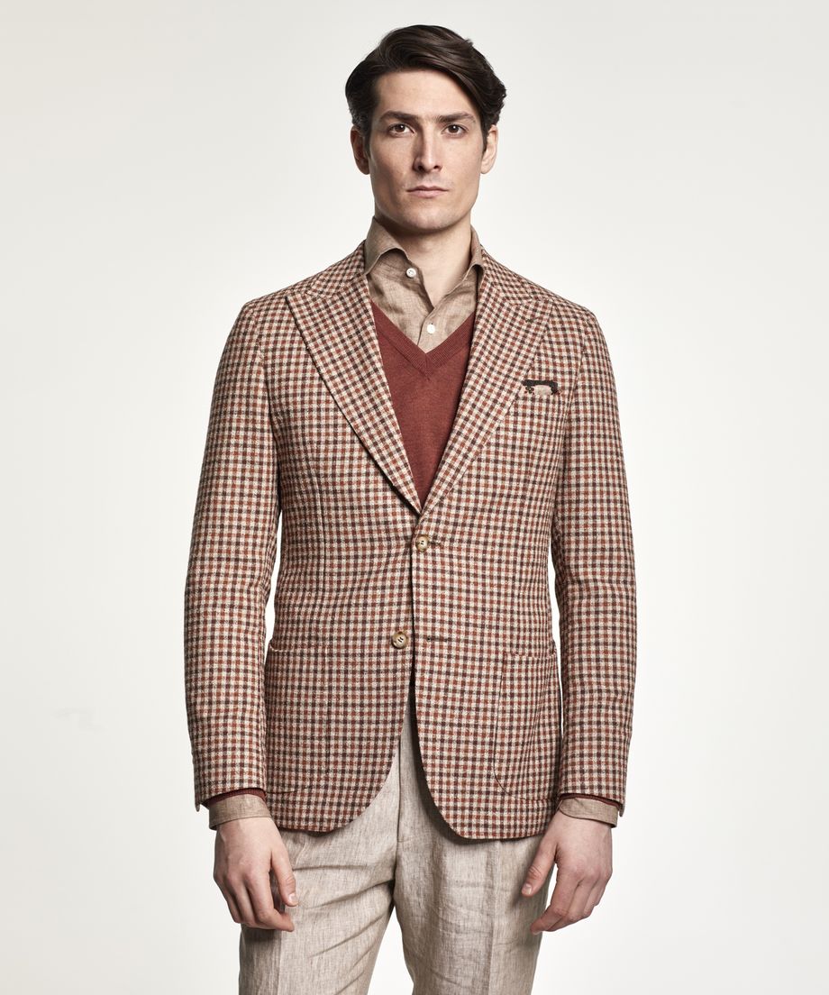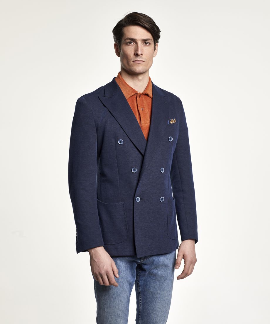 Single breasted blazer with two buttons and peak lapels. The blazer has a half canvas construction, called zero weight. Two patch pockets and one jetted chest pocket are placed at front. Two interior pockets. Half linedSide vents at backShell fabric: 100% WoolLining: 100% ViscoseDry cleaningYou find the matching suit trouser here: Fred Plain Suit TrouserThe model is 190 cm and wears size 48