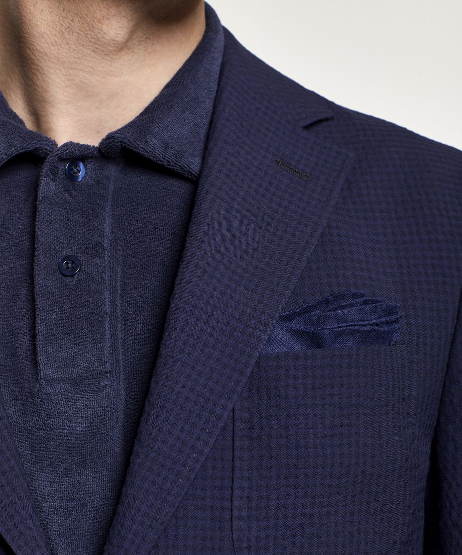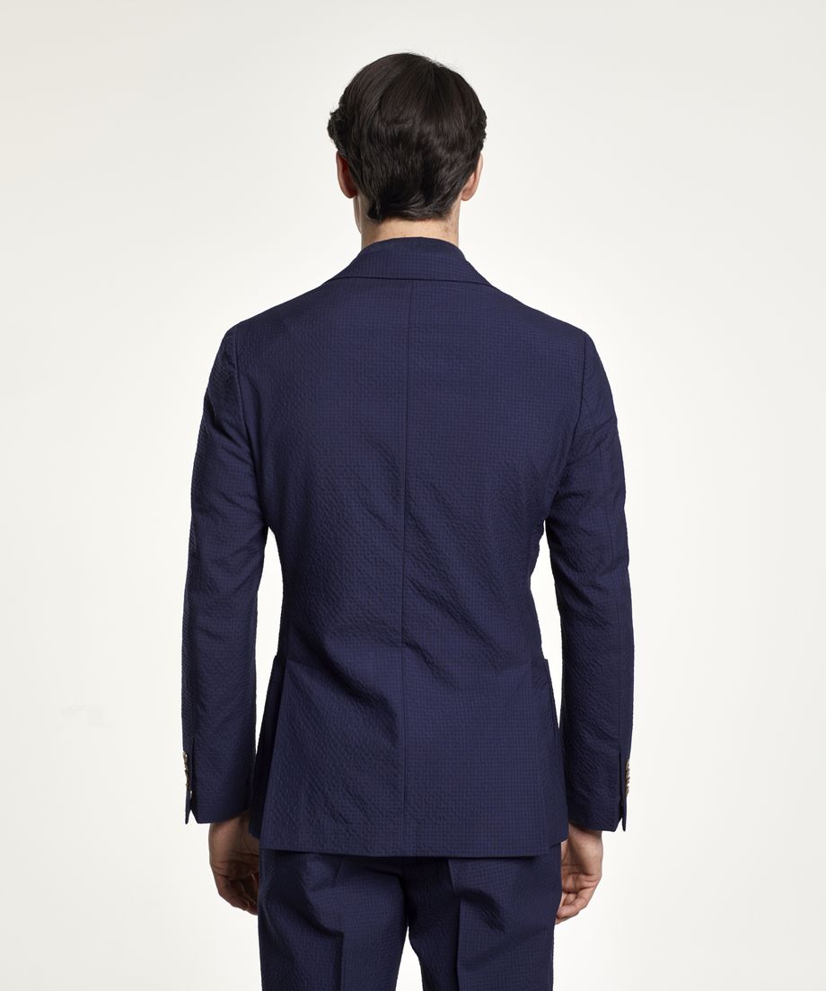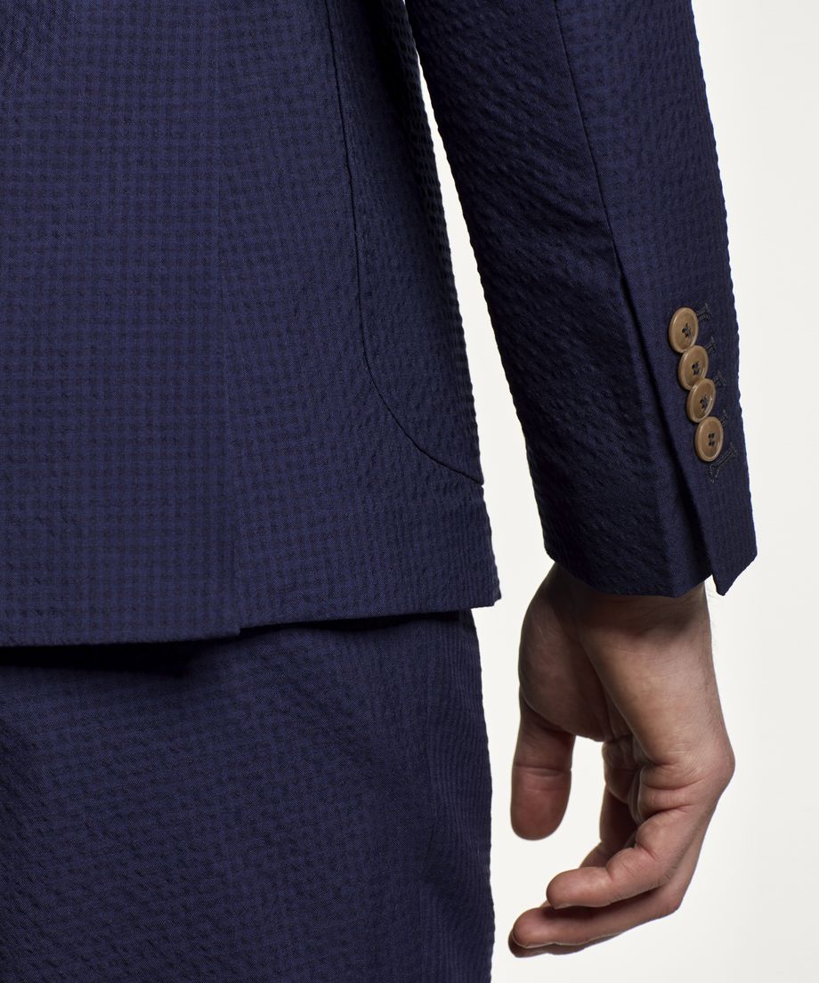 Single breasted seersucker suit jacket, made of a wool and cotton fabric from the Italian weaver Angelico. The suit jacket has two patched pockets and a patched chest pocket, that give the suit jacket a sporty look. Normal fitUnlined with bound seamsThree interior pocketsSide vents at back60% Wool, 40% CottonDry cleanYou find the suit trousers to this suit blazer here: Jason Seersucker Suit TrouserThe model is 190 cm and wears size 48.