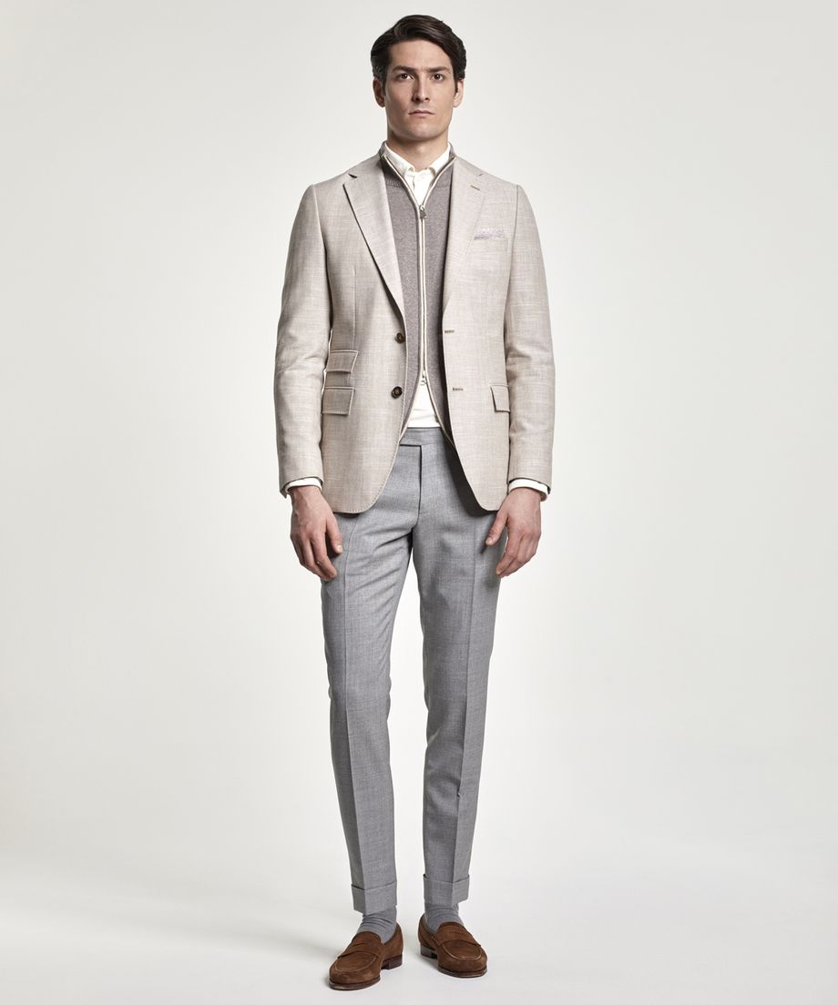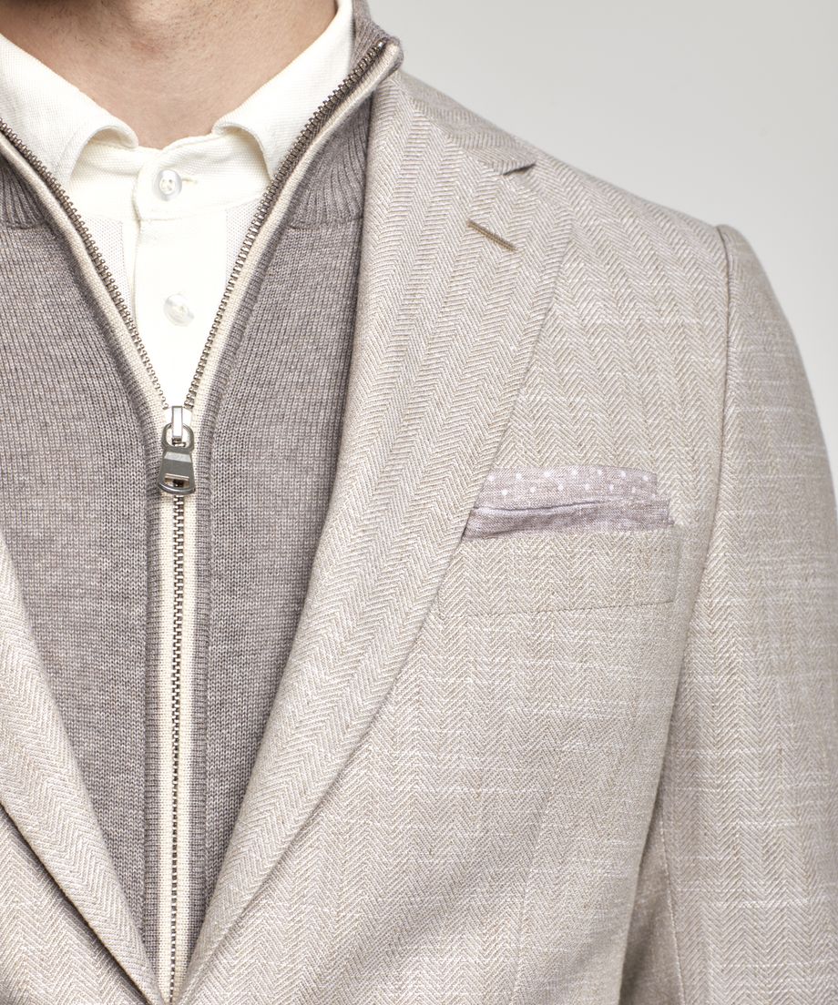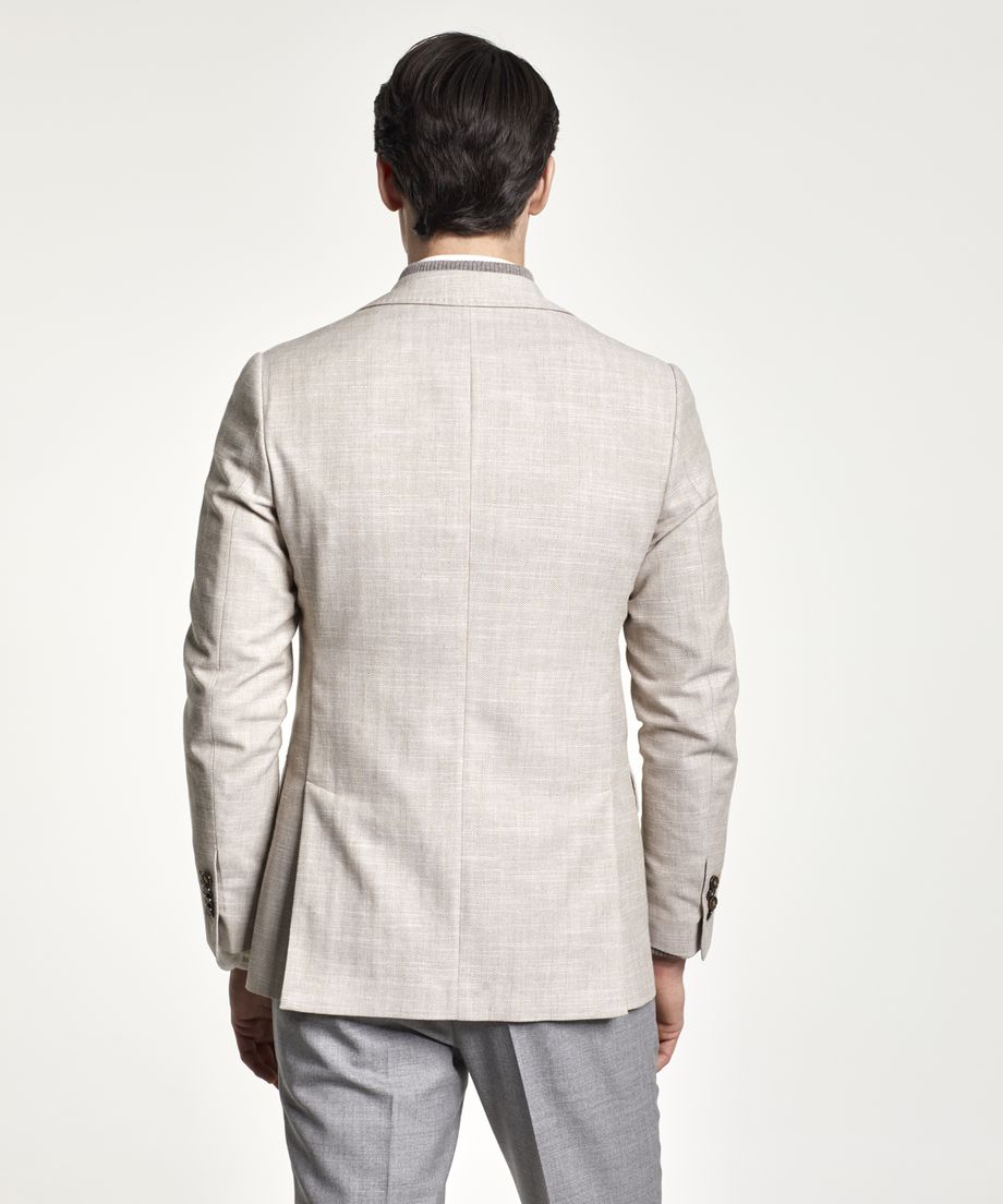 Single breasted Premium wool blazer made of a herringbone fabric from the Italian weaver Tollegno. Normal fitHalf linedTwo classic pockets with flaps, one ticket pocket with flap and a jetted chest pocket at frontTwo interior pocketsSide vents at backShell fabric: 100% WoolLining: 100% ViscoseDry cleanThe model is 190 cm and wears size 48.