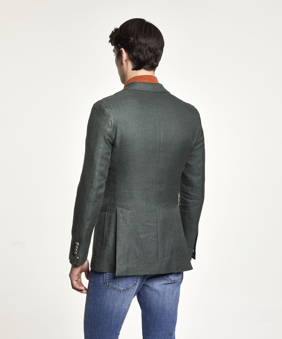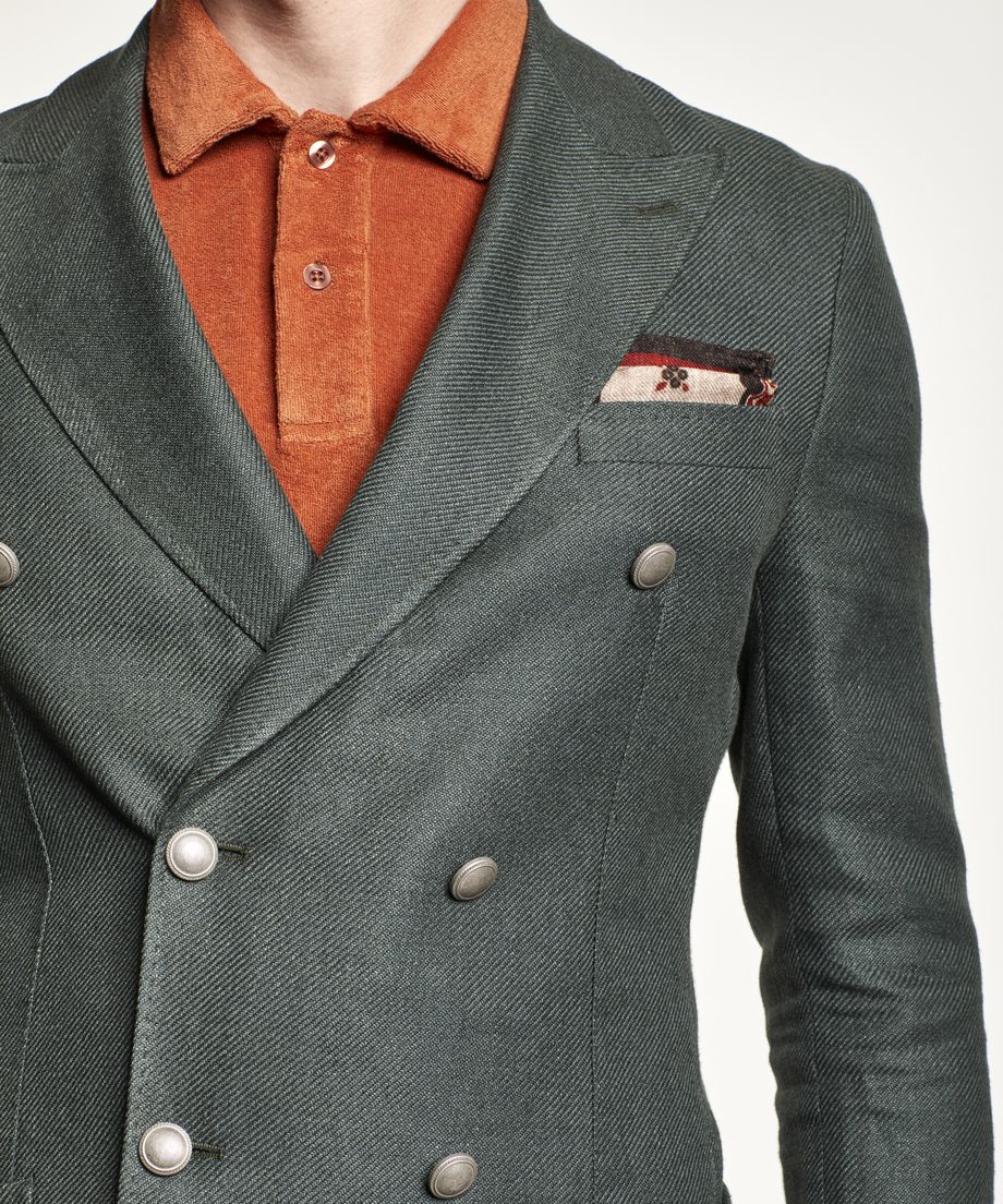 Double breasted Premium club blazer with decorative metal buttons. The blazer is made of a structure woven fabric from the Italian weaver Vitale Barberis Canonico. Normal fitUnlined with bound seamsTwo patched pockets and one jetted chest pocket are placed at frontTwo interior pocketsSide vents at back55% Linen, 25% Silk, 20% CottonDry cleanThe model is 190 cm and wears size 48.
