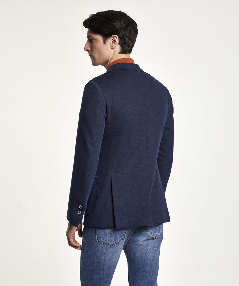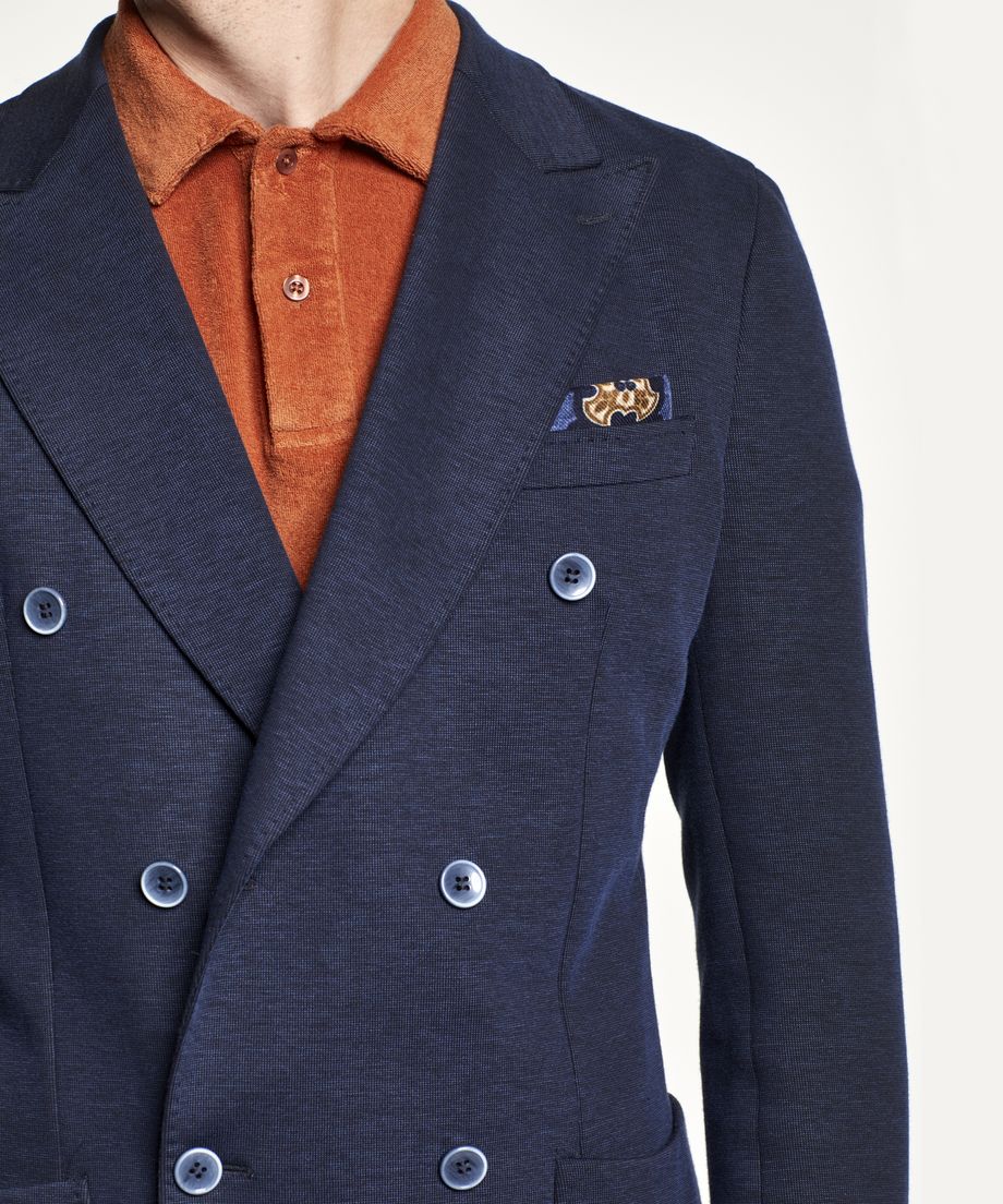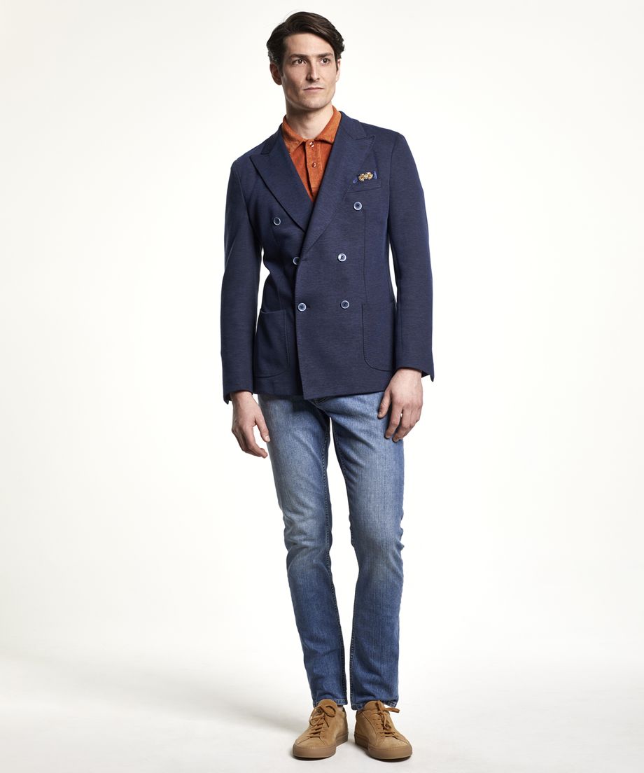 Premium double breasted jersey blazer with a modern and comfortable fit. The blazer has peak lapels and patch pockets for a sporty look. Unlined with tone on tone bound seams for a sober look.Classic interior pockets60% Cotton, 40% PolyamideDry cleanThe model is 190 cm and wears size 48.