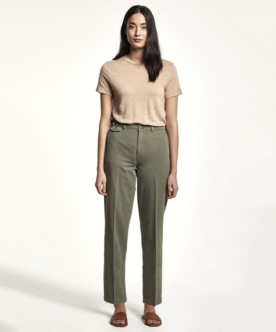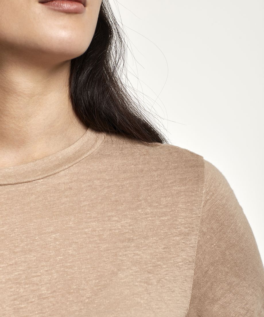 Lady tee in a soft linen quality. The fit is straight and boxy with crew neckline. Normal fit. Lily in gold metal placed at bottom.100% Linen. Machine wash 30 degrees