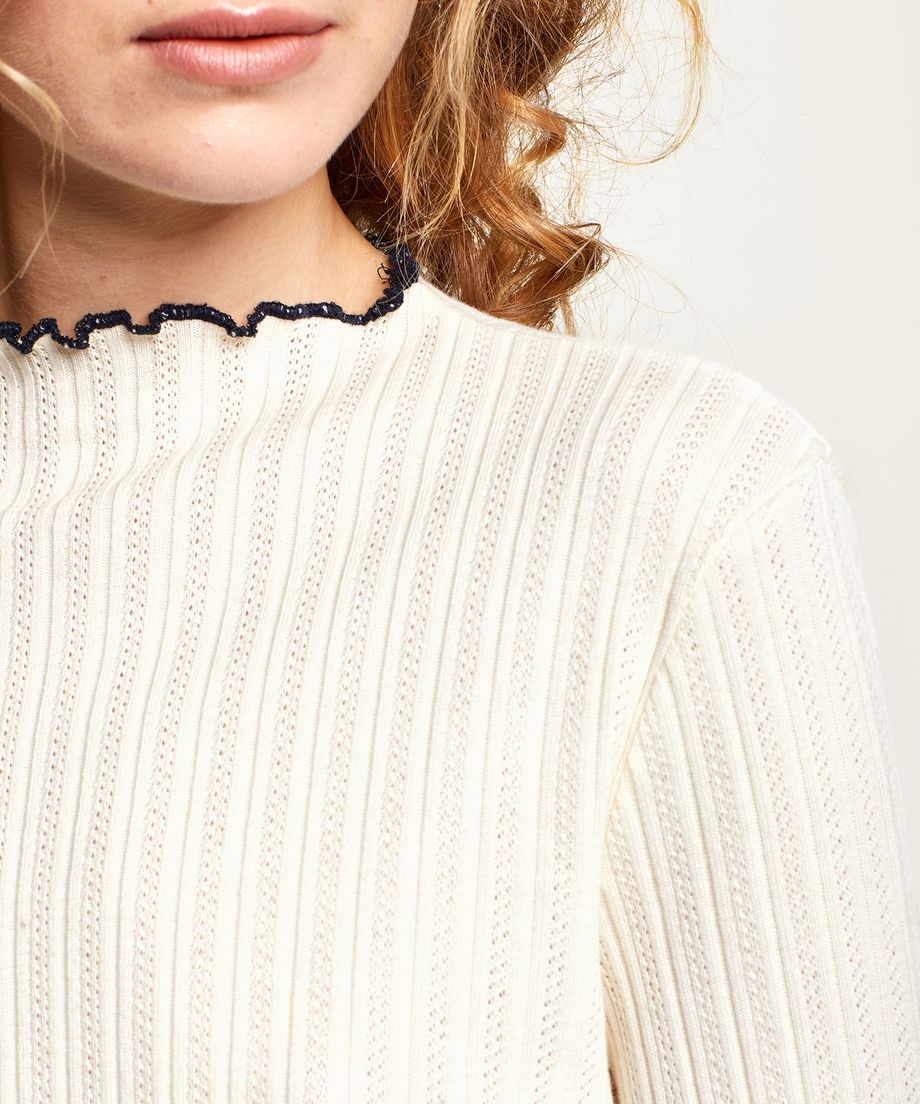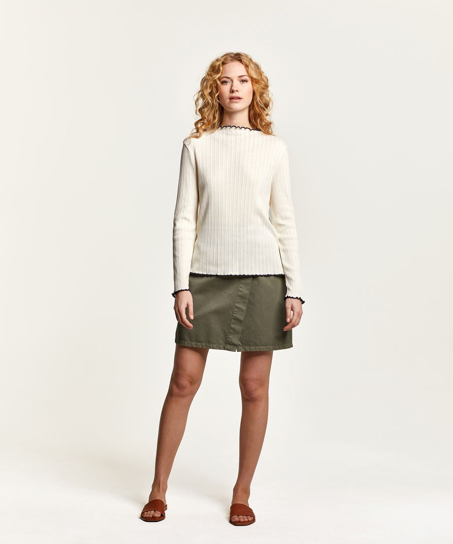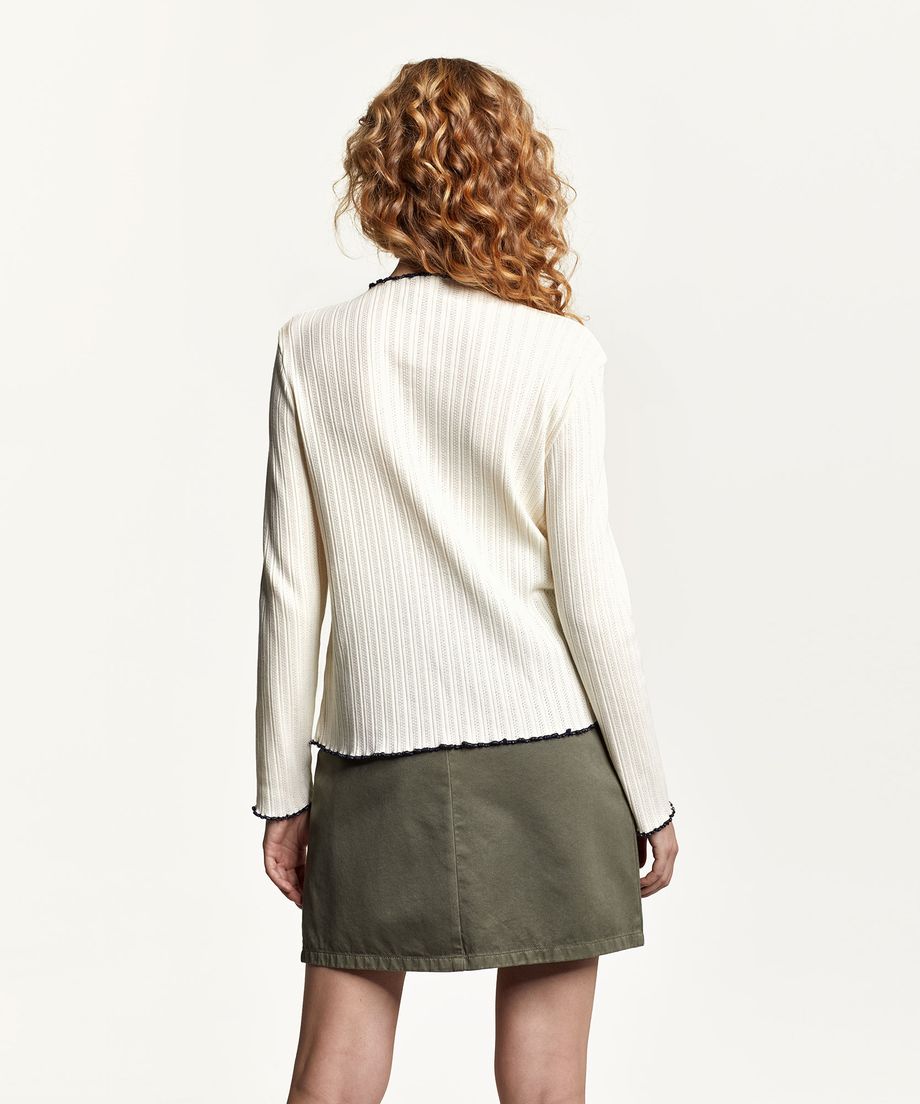 Lady top with decorative hole pattern, slightly higher neckline and long sleeve. The top has contrast edges at neck, sleeve ends and bottom hem. Normal fit. Lily in gold metal placed at bottom.50% Cotton, 50% PolyesterMachine wash 30 degrees