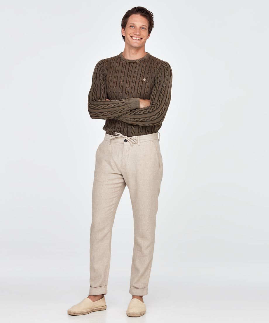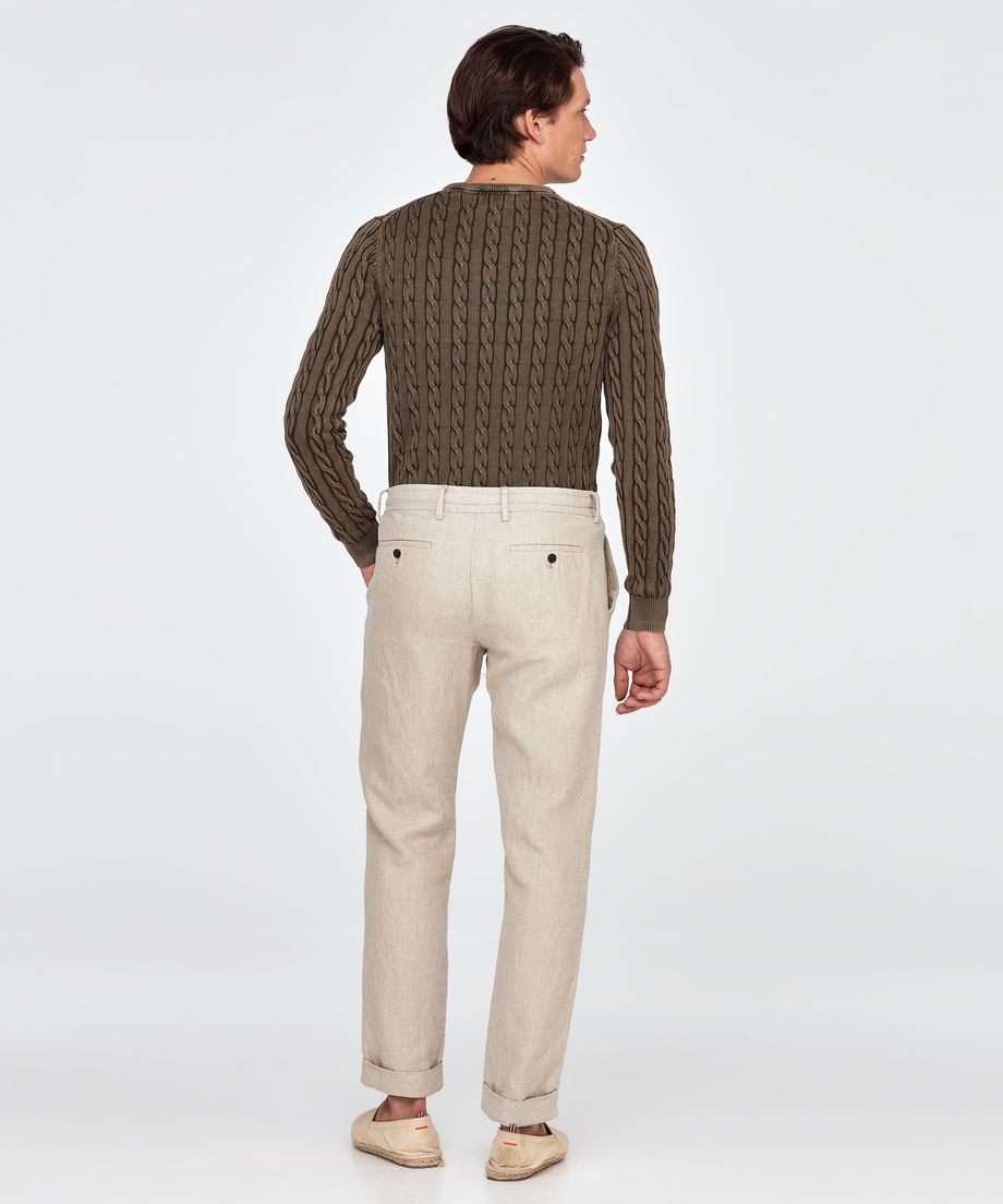 Slacks with drawstring at waist, made of a fine linen and cotton quality from the fabric supplier Dynamo. The slacks close with a button, metal zipper and hidden support button. The buttons on the slacks are corozo buttons, made from the corozo palm’s nuts. The slacks have two slanted front pockets and two jetted back pockets. Turn up at hem. Normal fit. Embroidered lily above right back pocket66% Linen, 34% CottonMachine wash 30 degrees
