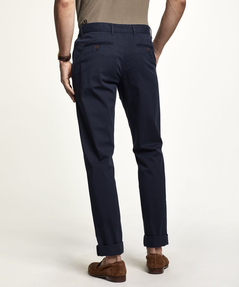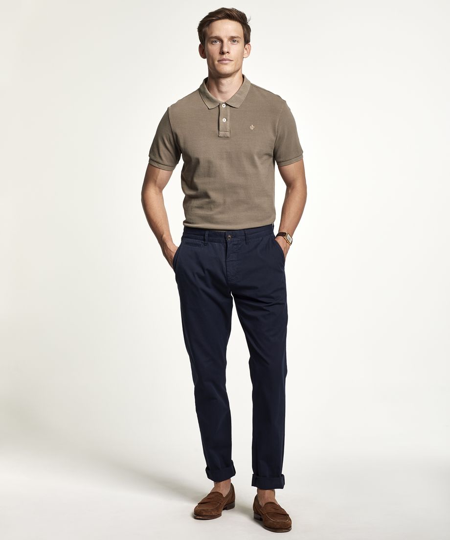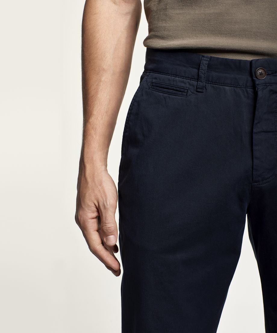 Classic chino made in a fine cotton twill with slight stretch, from the fabric supplier Dynamo. The fit is a in a regular seat, medium rise, straight leg and a regular leg opening. The chino closes with a button, metal zip closure and hidden support button. The buttons used on the chino are corozo buttons, made from the corozo palm’s nuts. The carefully made interior of the chino shows the fine craftsmanship. The chino has two slanted front pockets and a coin pocket. At back, two double welt pockets with button closure. Normal fit. Embroidered lily above right back pocketGarment dyed for a unique look and washed look98% Cotton, 2% ElastaneMachine wash 40 degrees