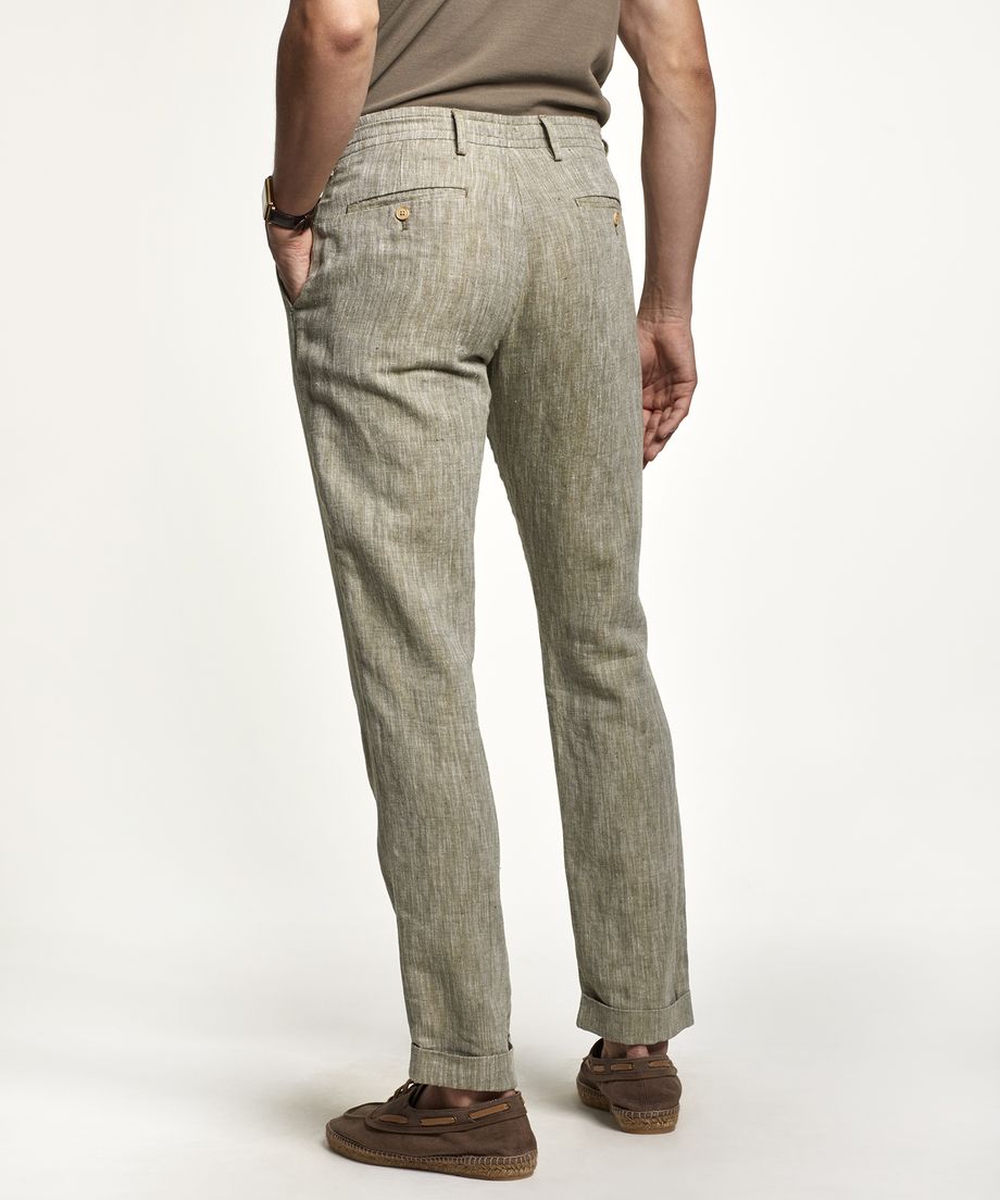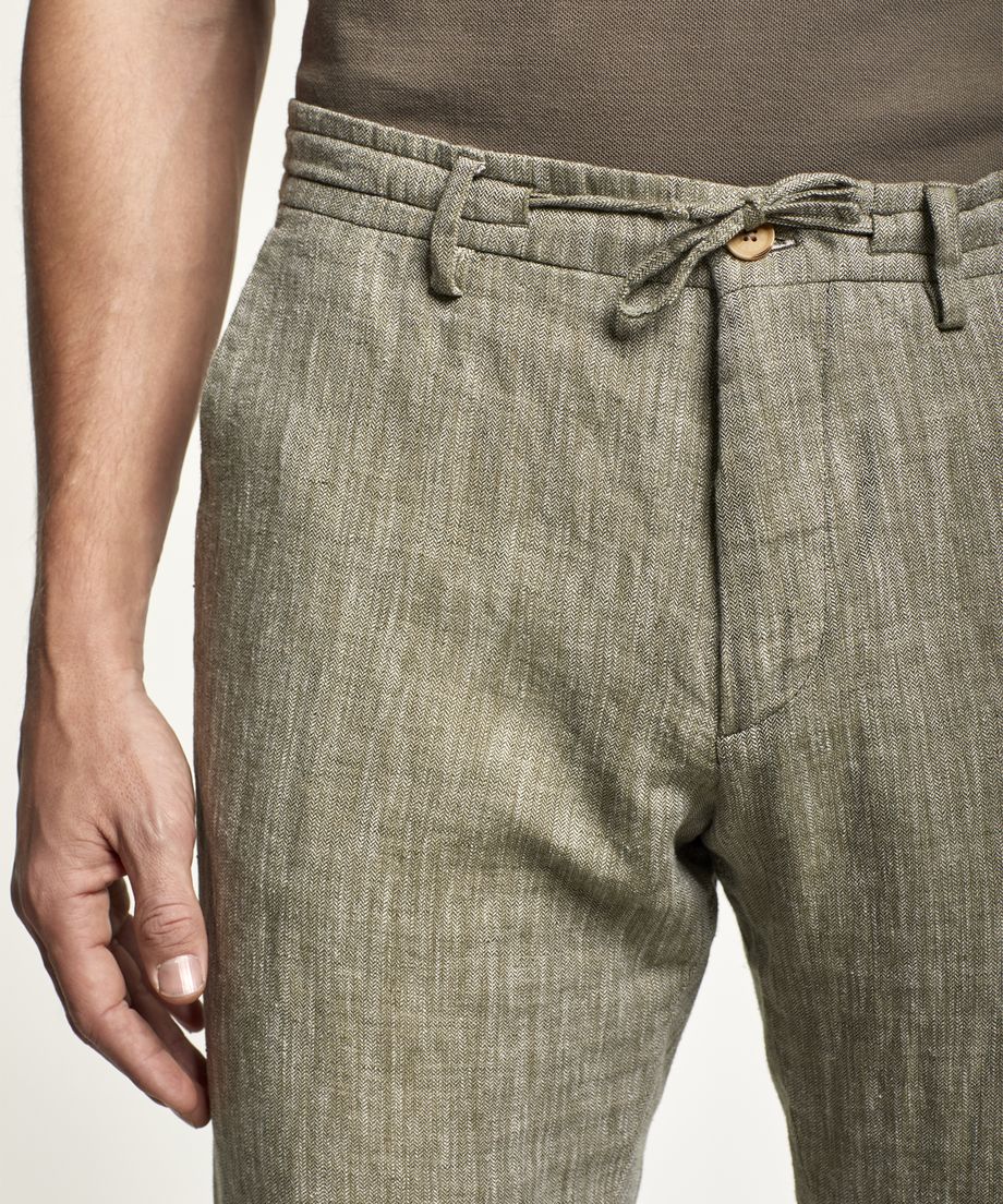 Slacks with drawstring at waist, made of a fine linen and cotton quality from the fabric supplier Dynamo. The slacks close with a button, metal zipper and hidden support button. The buttons on the slacks are corozo buttons, made from the corozo palm’s nuts. The slacks have two slanted front pockets and two jetted back pockets. Turn up at hem. Normal fit. Embroidered lily above right back pocket74% Linen, 26% CottonMachine wash 40 degrees