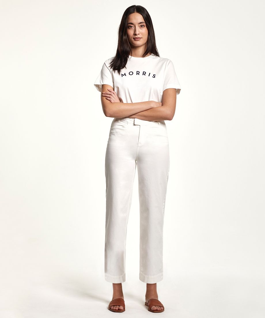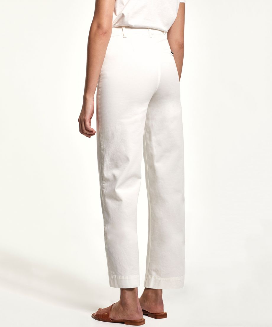 A new style in Lady’s trouser assortment with high waist, flared and cropped leg. The trouser is made of a cotton fabric with twill structure and slight stretch for increased comfort. Closes with a hidden hook and eye, support button and metal zipper. Two slanted front pockets and back pockets with button through. metal charm in gold metal placed at waistband.75% Organic Cotton, 23% Recycled Cotton, 2% LycraMachine wash 30 degrees