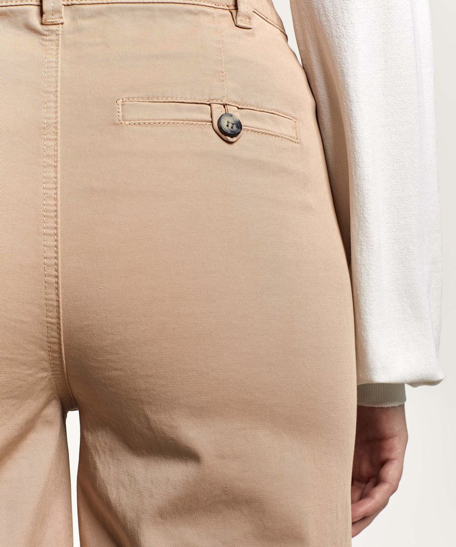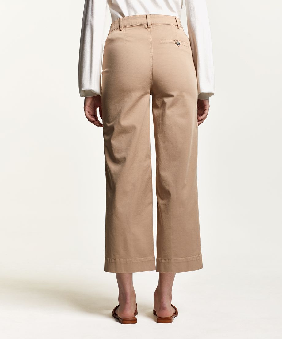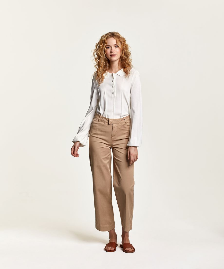 A new style in Lady’s trouser assortment with high waist, flared and cropped leg. The trouser is made of a cotton fabric with twill structure and slight stretch for increased comfort. Closes with a hidden hook and eye, support button and metal zipper. Two slanted front pockets and back pockets with button through. metal charm in gold metal placed at waistband.75% Organic Cotton, 23% Recycled Cotton, 2% LycraMachine wash 30 degrees