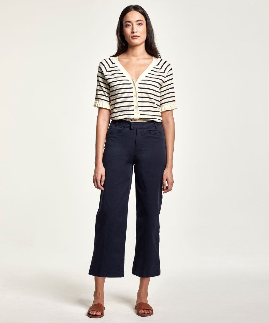 A new style in Lady’s trouser assortment with high waist, flared and cropped leg. The trouser is made of a cotton fabric with twill structure and slight stretch for increased comfort. Closes with a hidden hook and eye, support button and metal zipper. Two slanted front pockets and back pockets with button through. metal charm in gold metal placed at waistband.75% Organic Cotton, 23% Recycled Cotton, 2% LycraMachine wash 30 degrees