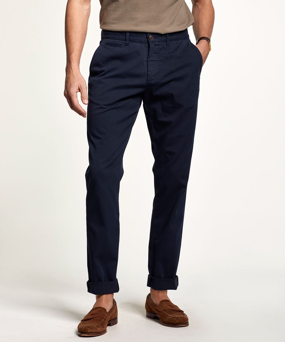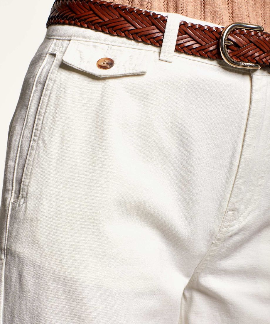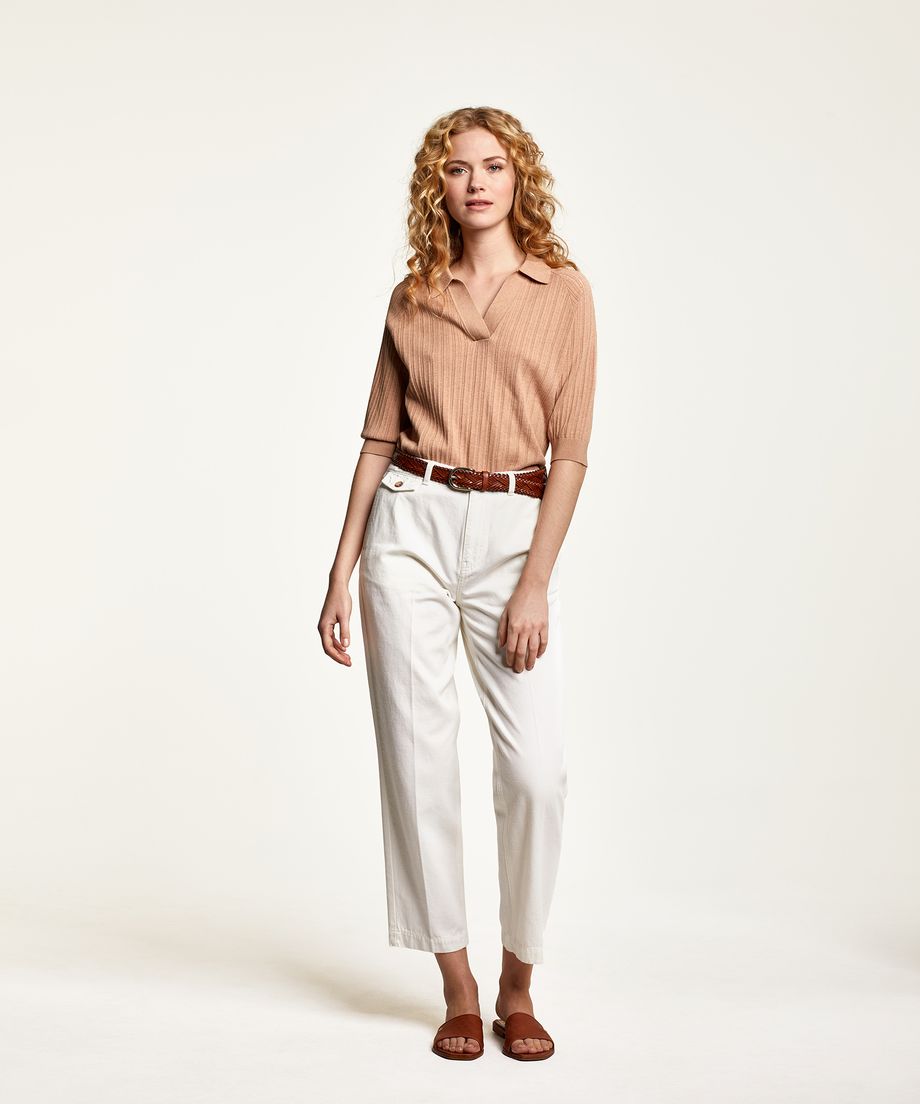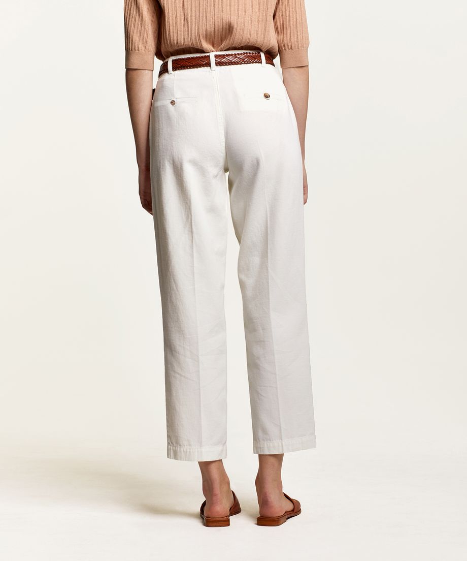 Lady’s new chino with inspiration from the men’s wardrobe. The chino has high waist, front pleats, straight leg with press folds and full length. Closes with two buttons and a metal zipper. The chino has a decorative coin pocket, two front pockets placed at side seams and back pockets with button through. Paulette Chinos is a timeless, classic chino that lasts season after season. 80% Cotton, 20% Linen. Machine wash 30 degrees