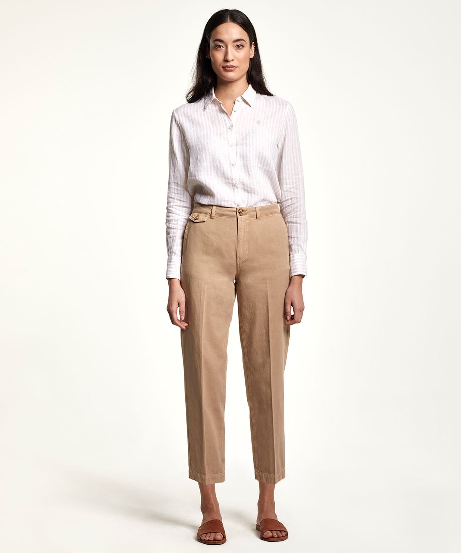 Lady’s new chino with inspiration from the men’s wardrobe. The chino has high waist, front pleats, straight leg with press folds and full length. Closes with two buttons and a metal zipper. The chino has a decorative coin pocket, two front pockets placed at side seams and back pockets with button through. Paulette Chinos is a timeless, classic chino that lasts season after season. 80% Cotton, 20% Linen. Machine wash 30 degrees