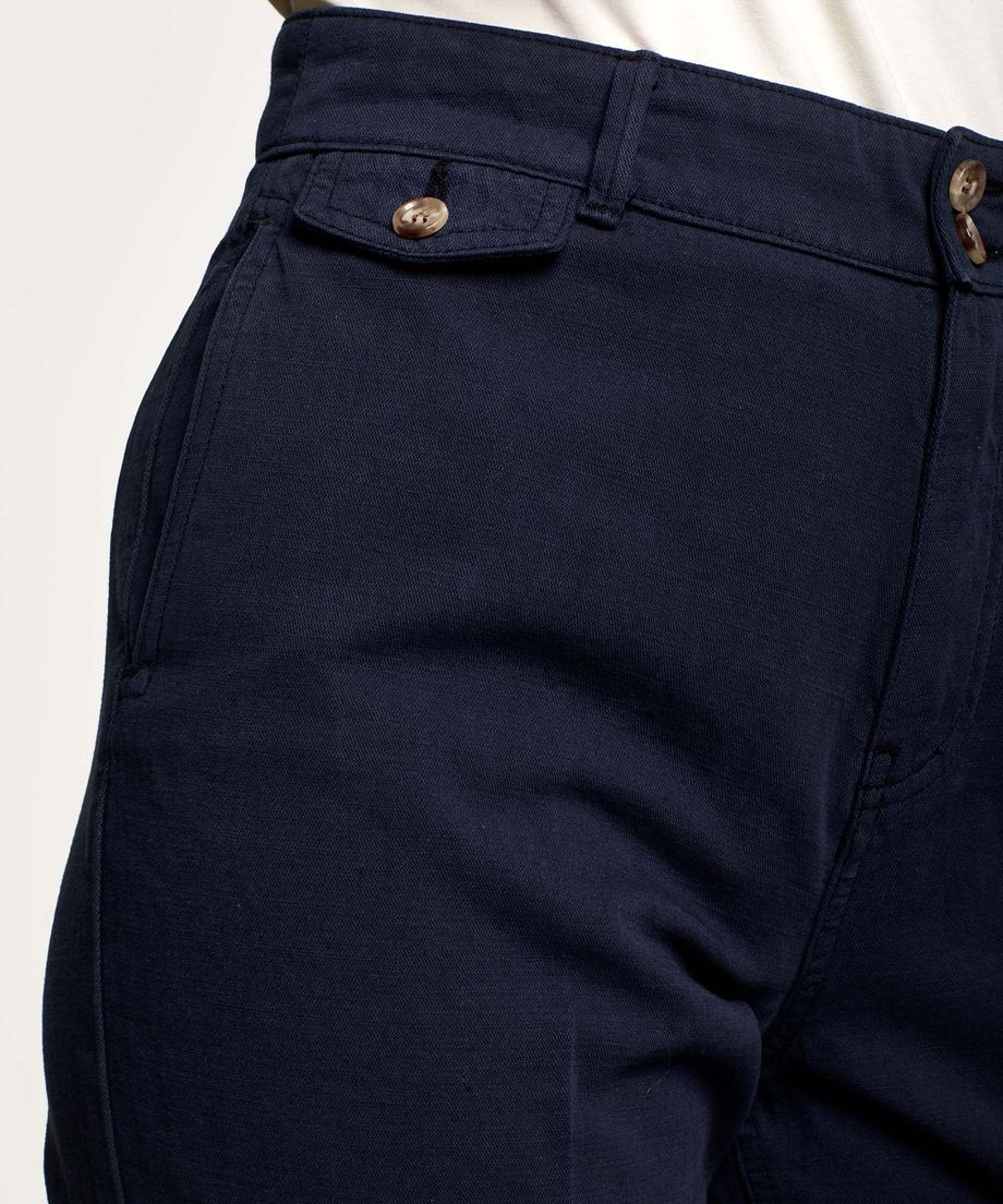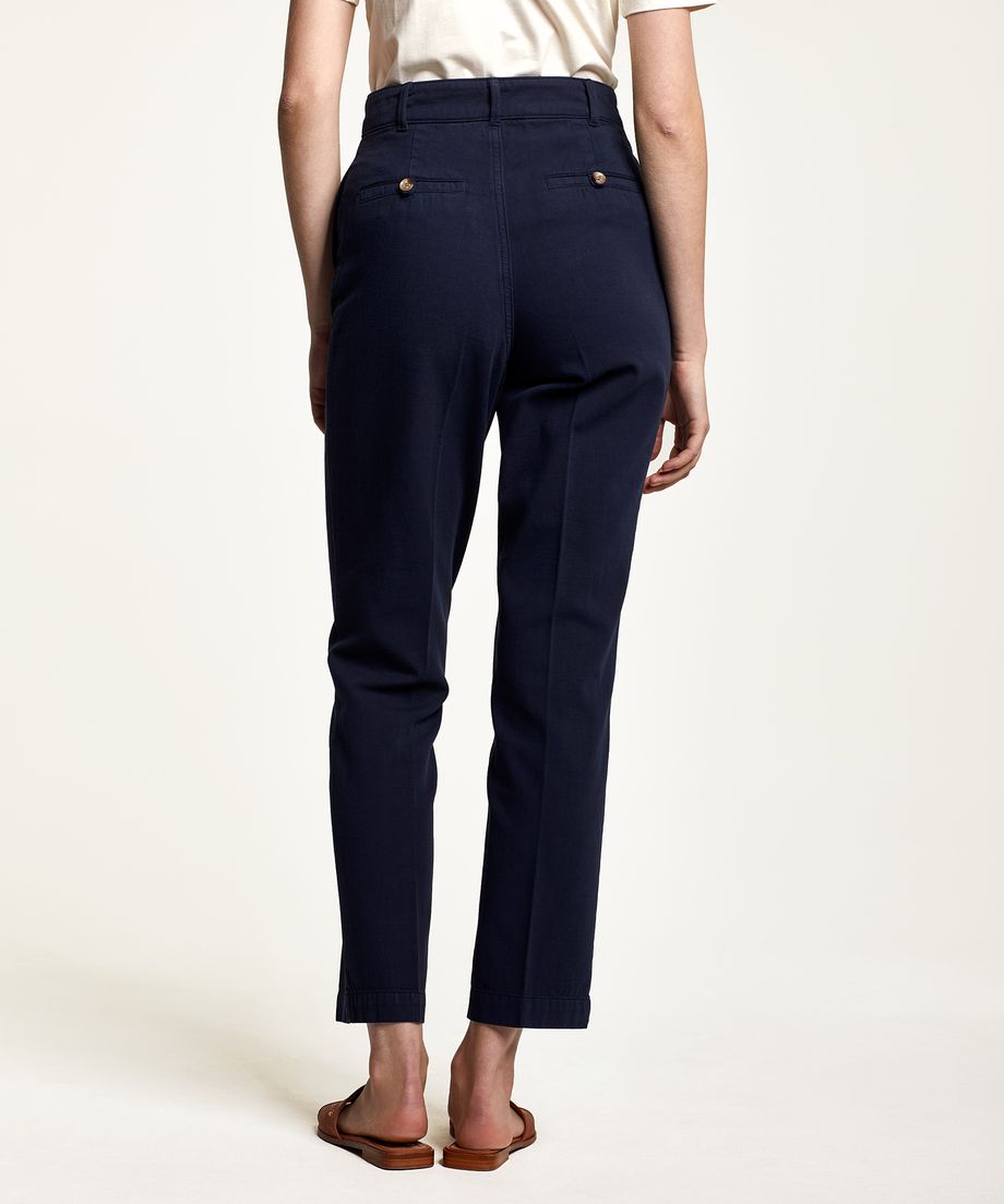 Lady’s new chino with inspiration from the men’s wardrobe. The chino has high waist, front pleats, straight leg with press folds and full length. Closes with two buttons and a metal zipper. The chino has a decorative coin pocket, two front pockets placed at side seams and back pockets with button through. Paulette Chinos is a timeless, classic chino that lasts season after season. 80% Cotton, 20% Linen. Machine wash 30 degrees
