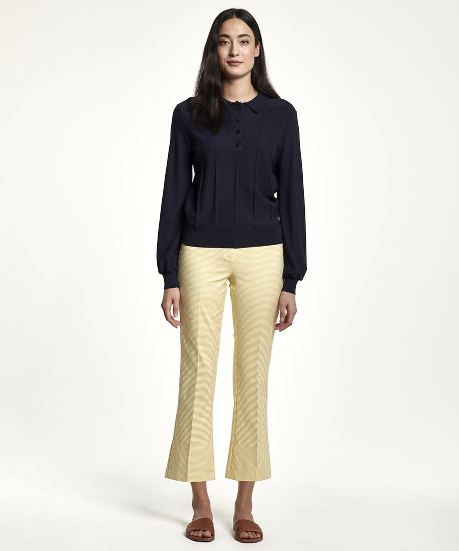 Our popular style with a flared leg and cropped length, in a model called kick flare,. This season in a classic gingham check. The trouser has press folds at front and back. Closes with hidden hook and eye, zipper and hidden support button. Two slanted pockets are placed at front, and two jetted fake pockets at back. Normal fitmetal charm in gold metal placed at waistband.53% Viscose, 45% Cotton, 2% ElastaneMachine wash 30 degrees. The model is 180 cm and wears size 36.