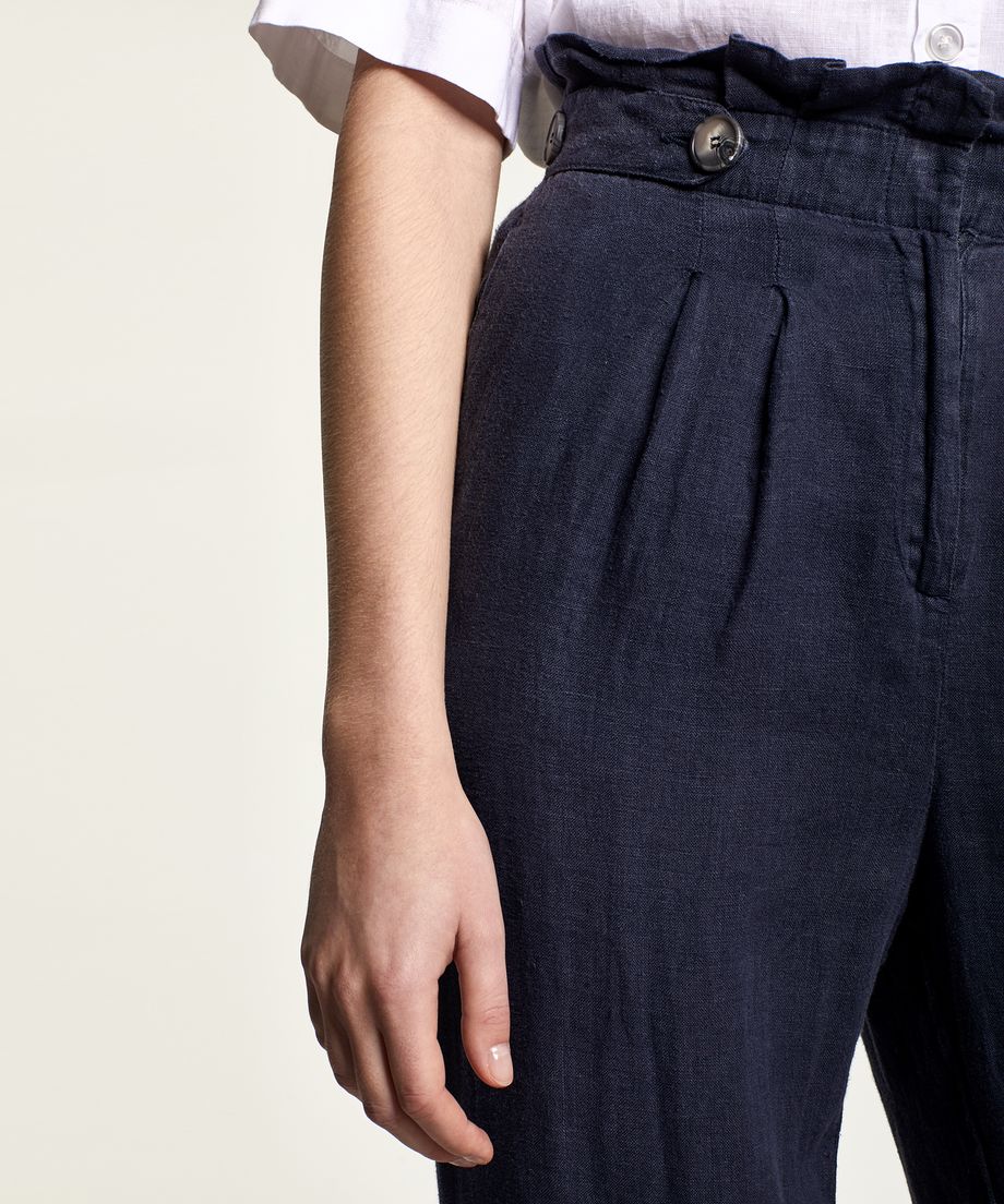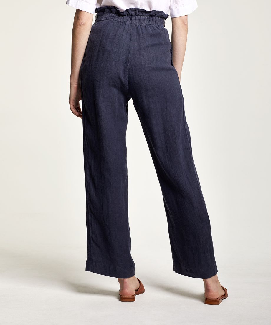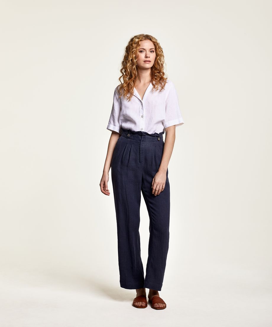 Lady linen trouser with paper bag waist, front pleats and wide flattering leg. Adjustable straps with buttons are placed at waist. The trouser has fabric covered elastic and closes with a zipper and front. Normal fit100% Linen. Machine wash 30 degrees