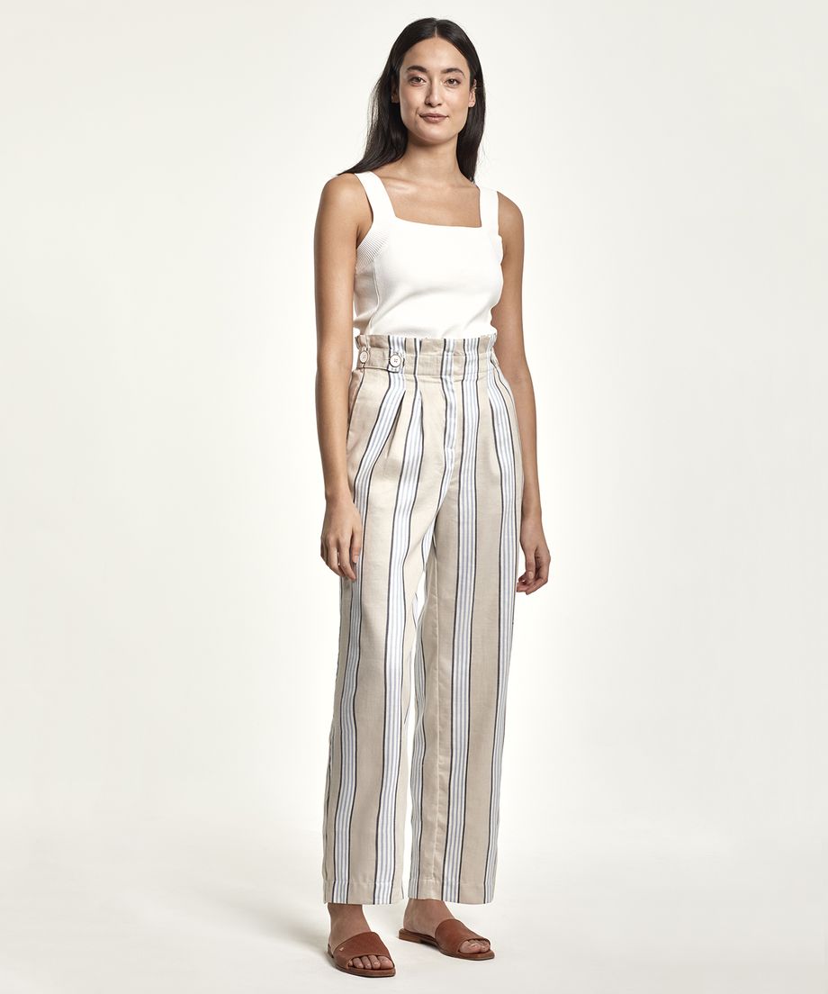 Lady trouser with paper bag waist and wide leg. Adjustable straps with buttons are placed at waist. The trouser has fabric covered elastic and closes with a zipper and front. Normal fit59% Linen, 29% Polyester, 12% ViscoseMachine wash 30 degrees