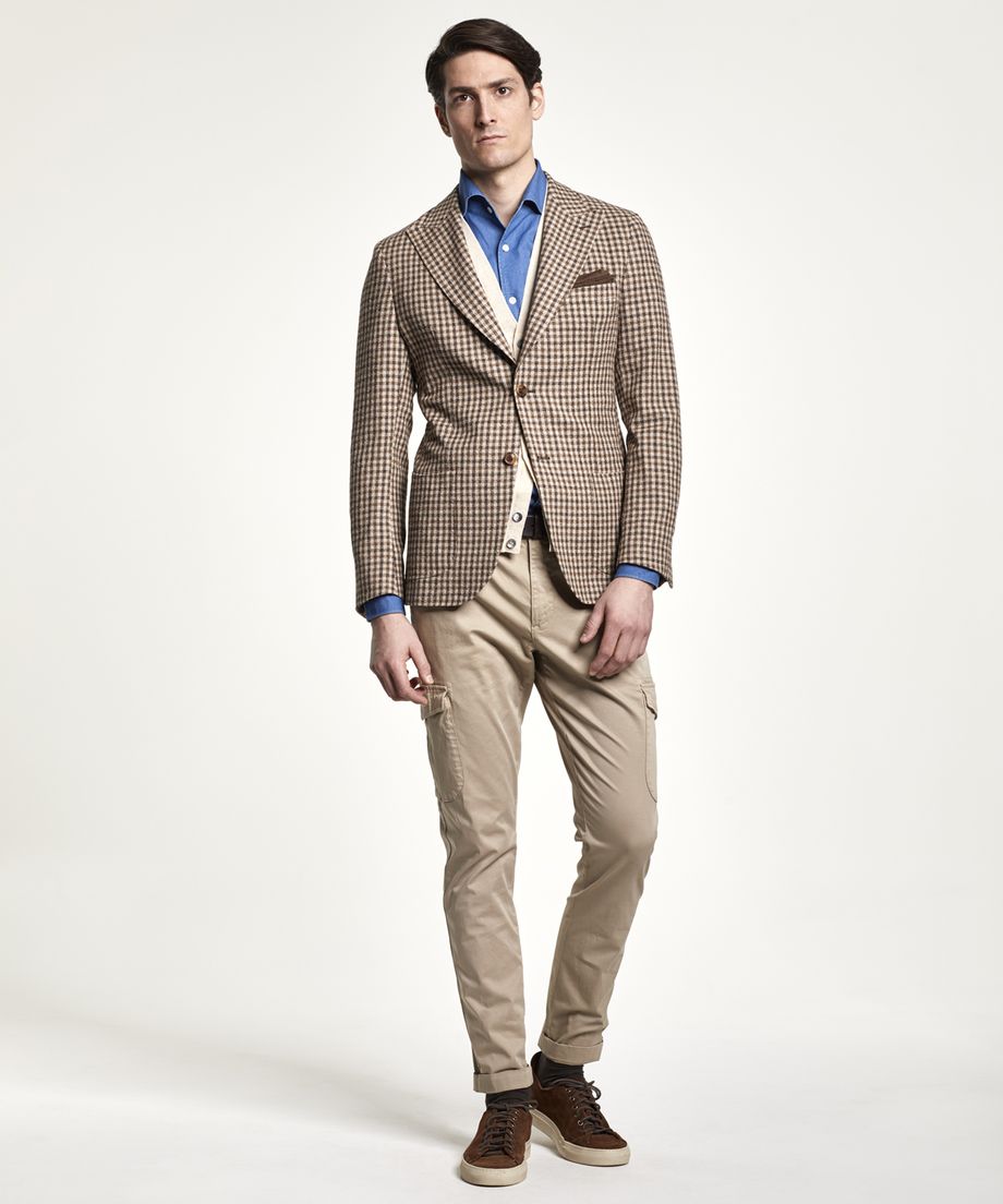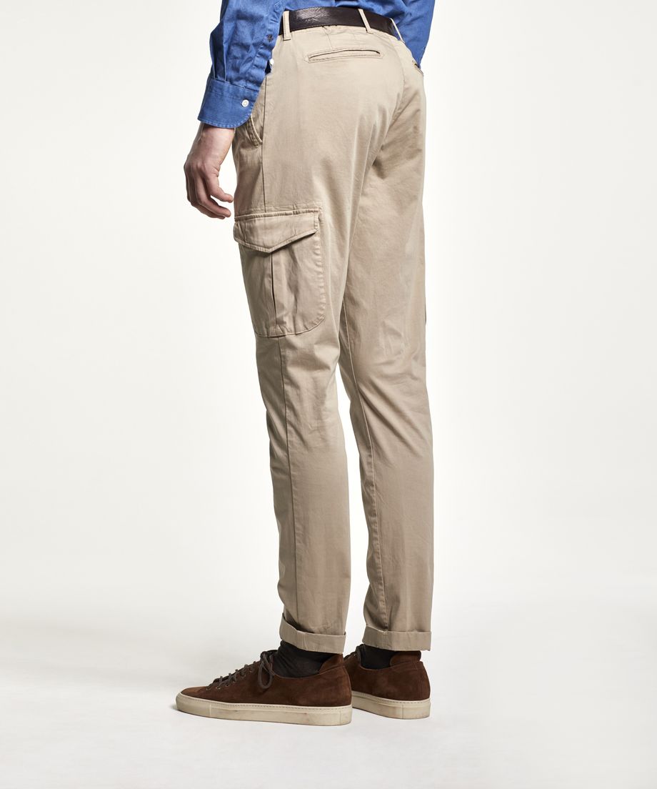Premium dressed cargo pants made of a cotton satin from Textil Santanderina. The pants have two slanted front pockets and two patched leg pockets with flaps, characteristic for this style of pants. Two double welted pockets are placed at back. The cargo pant closes with a button and metal zipper at front. Normal fit98% Cotton, 2% ElastaneThe model is 190 cm and wears size 48.