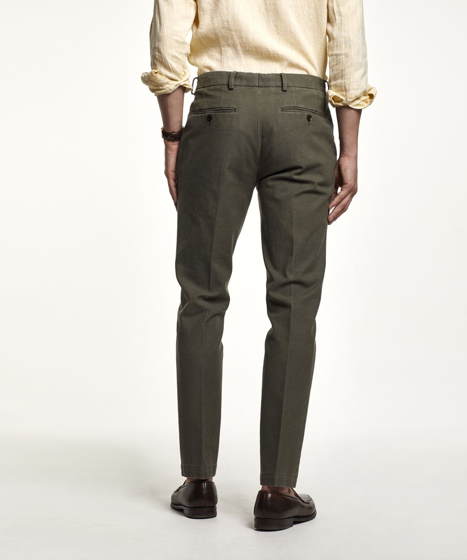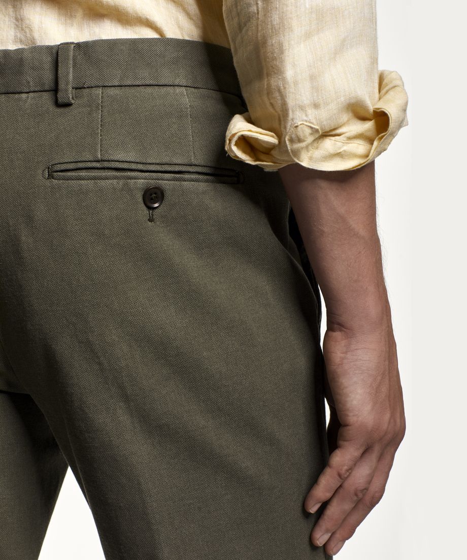 Cotton trouser with a washed look, made of fabric signed by the Italian weaver Tessitura Di Albizzate. The trouser has flat front, two slanted front pockets and two jetted back pockets with button through. Normal fit97% Cotton, 3% ElastaneDry cleanYou find the blazer here: Portofino Washed Cotton Jacket