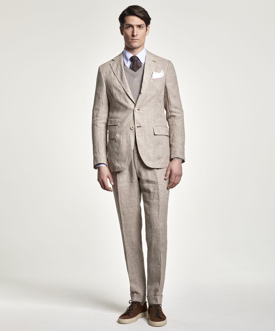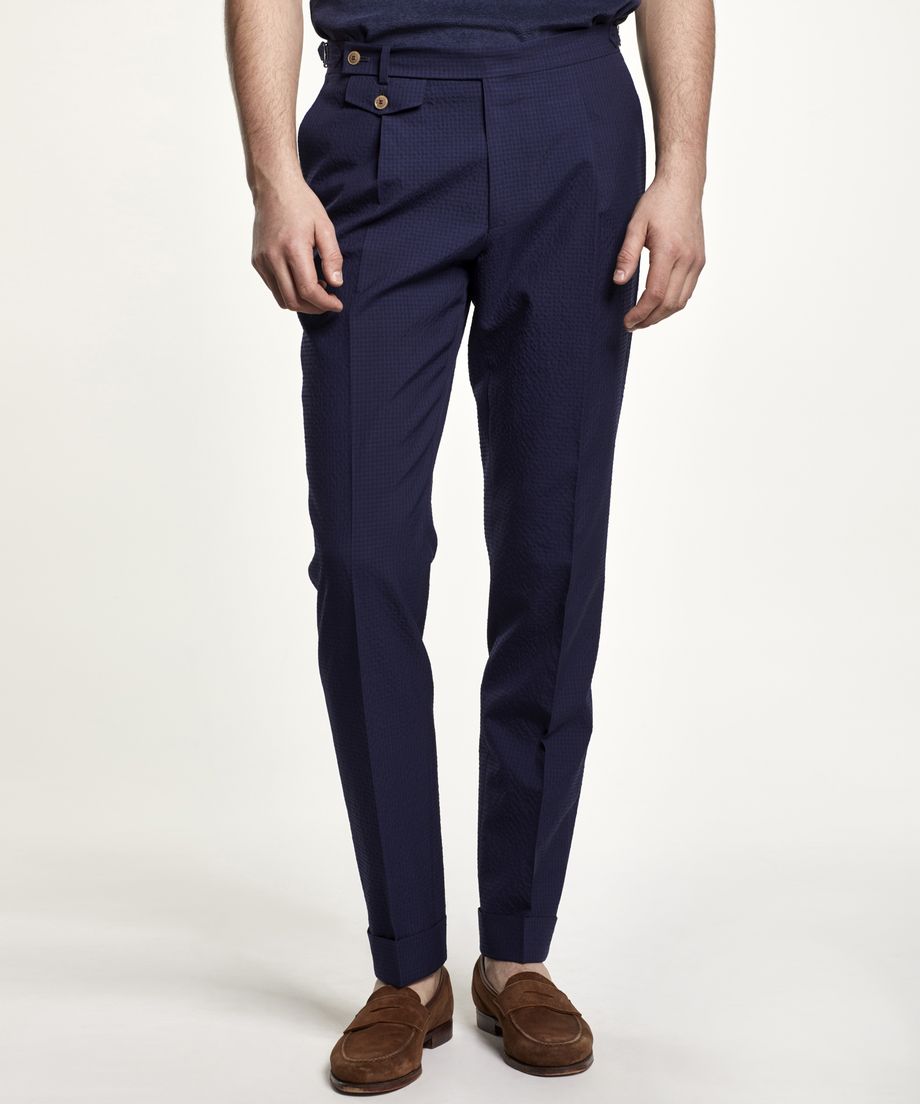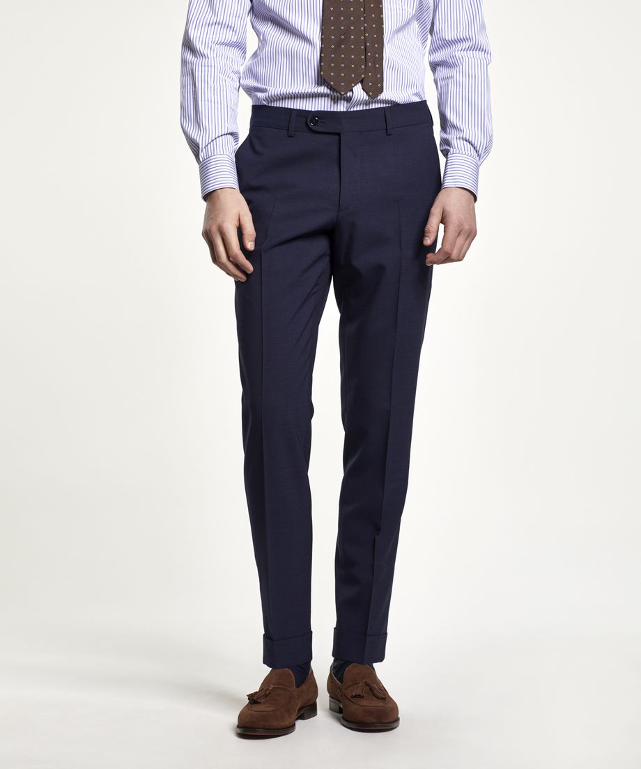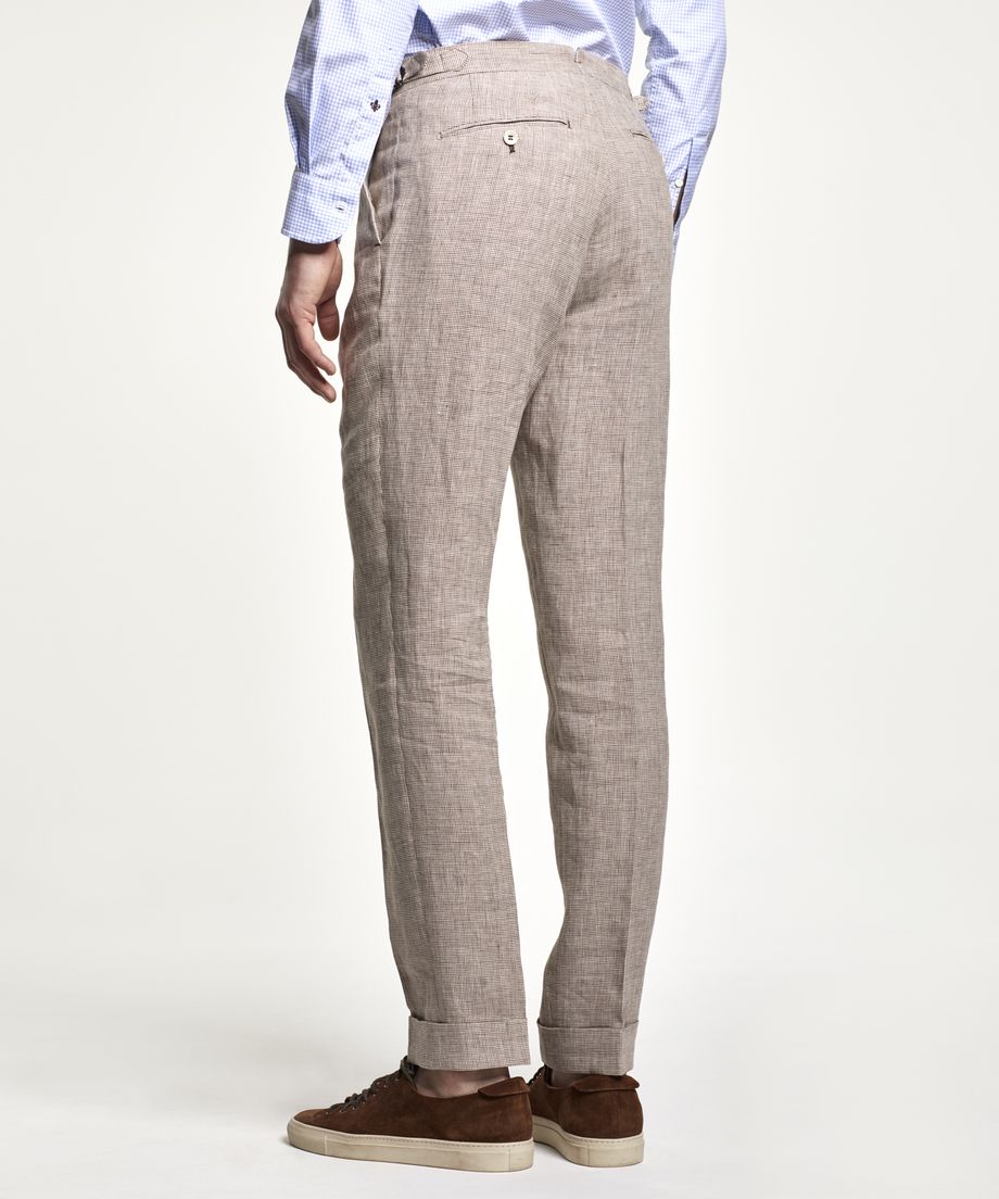 Premium suit trouser made of a checked linen fabric from the Italian weaver Solbiati. The trouser has a slightly higher waist, front pleats and side adjusters at waist. Closes with a button, hidden hook and eye and zip fly. Two slanted pockets and one coin pocket are placed at front. Two jetted pockets at back with button through. Five centimeters turn up at bottom hem. Normal fitKnee lined100% LinenDry cleanYou find the suit blazer to this suit trouser here: John Minicheck Suit BlazerThe model is 190 cm and wears size 48.