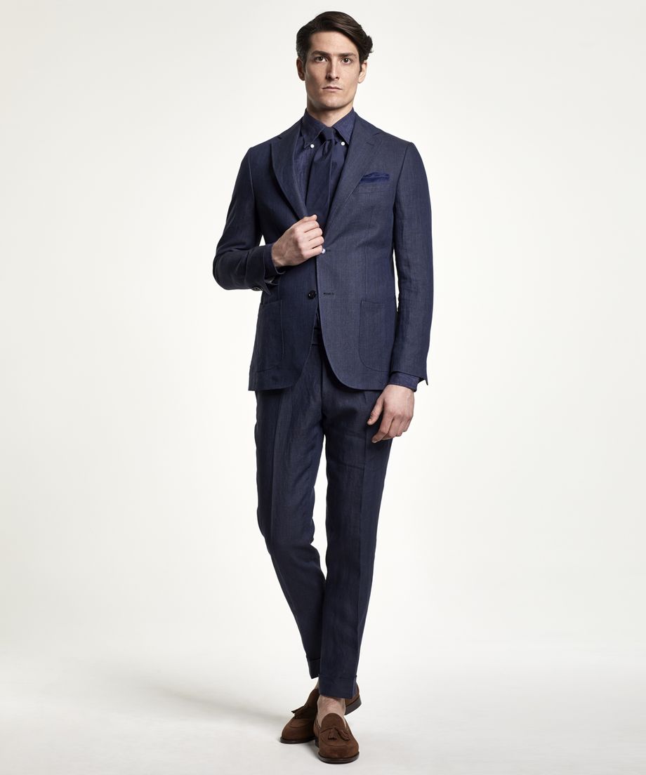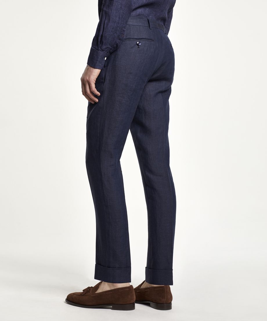 Premium linen suit trouser with flat front made of a fabric from the Italian weaver Angelico. The suit trouser has two slanted front pockets and two jetted back pockets with button through. Closes with a button, hidden hook and eye and zip fly. Five centimeters turn up at bottom hem. Normal fitKnee lined100% LinenDry cleanYou find the suit jacket to this suit trouser here: Mike Linen Suit JacketThe model is 190 cm and wears size 48.
