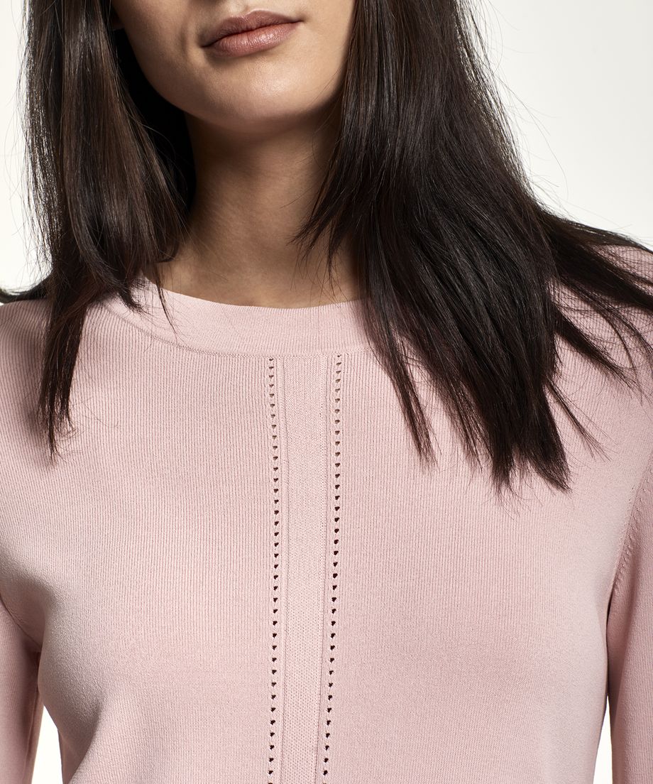 Knitted dress with a slight A-lined shape and length that ends above the knee. The dress has long sleeve with decorative slit at sleeve end. Decorative knitted stripe at front in a divergent knitting technique together with pointelle stitching Normal fit65% Viscose, 35% NylonHand washThe model is 180 cm and wears size S.