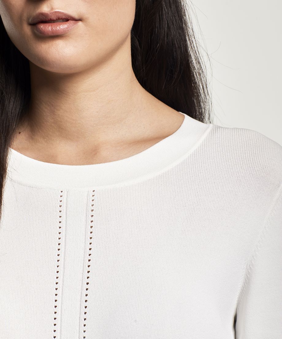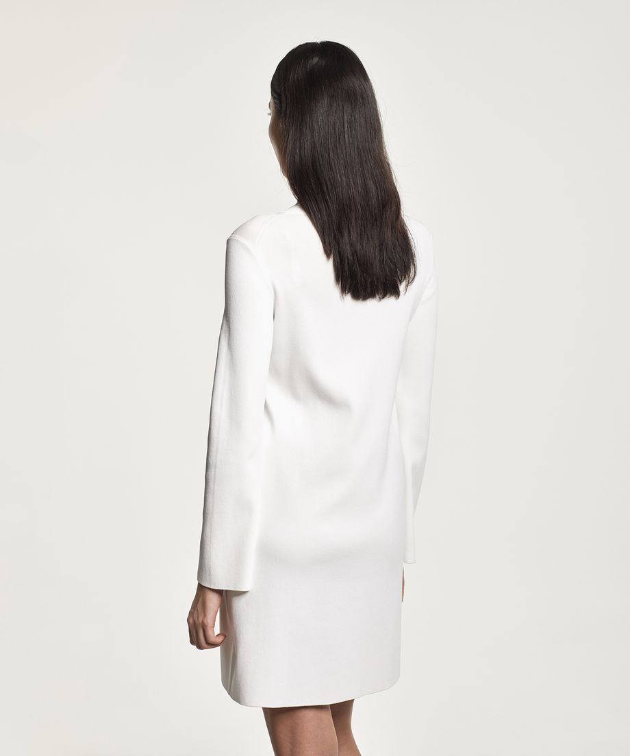 Knitted dress with a slight A-lined shape and length that ends above the knee. The dress has long sleeve with decorative slit at sleeve end. Decorative knitted stripe at front in a divergent knitting technique together with pointelle stitching Normal fit65% Viscose, 35% NylonHand washThe model is 180 cm and wears size S.