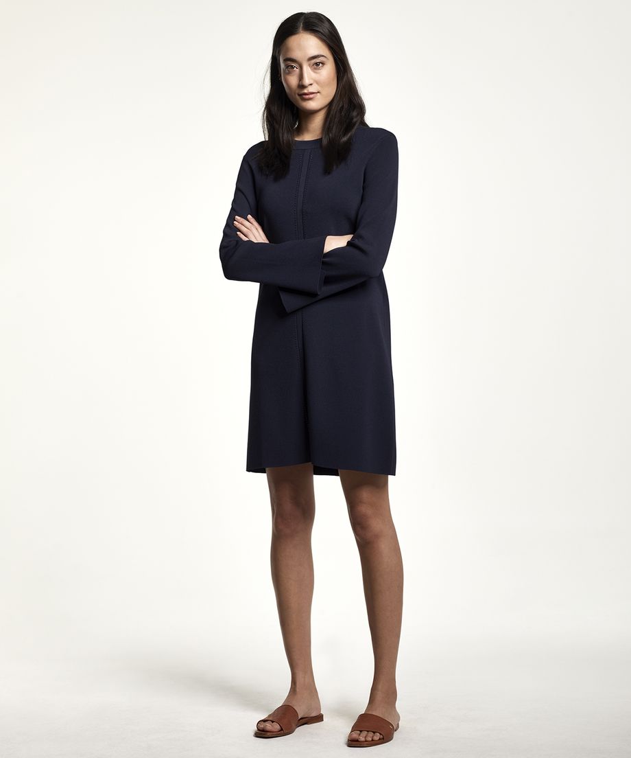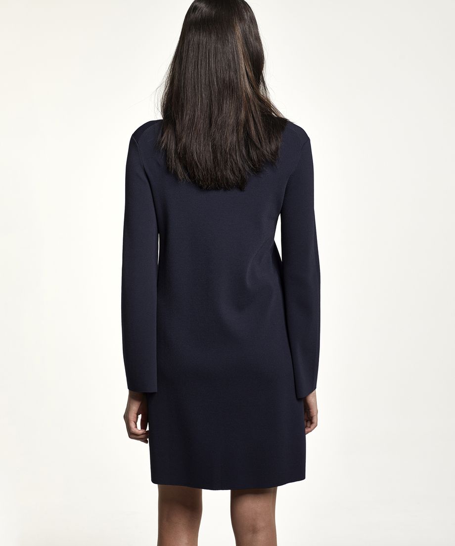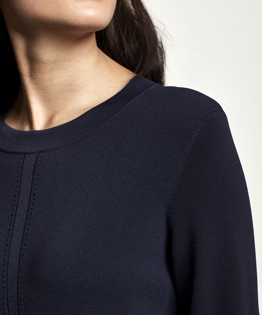 Knitted dress with a slight A-lined shape and length that ends above the knee. The dress has long sleeve with decorative slit at sleeve end. Decorative knitted stripe at front in a divergent knitting technique together with pointelle stitching Normal fit65% Viscose, 35% NylonHand washThe model is 180 cm and wears size S.
