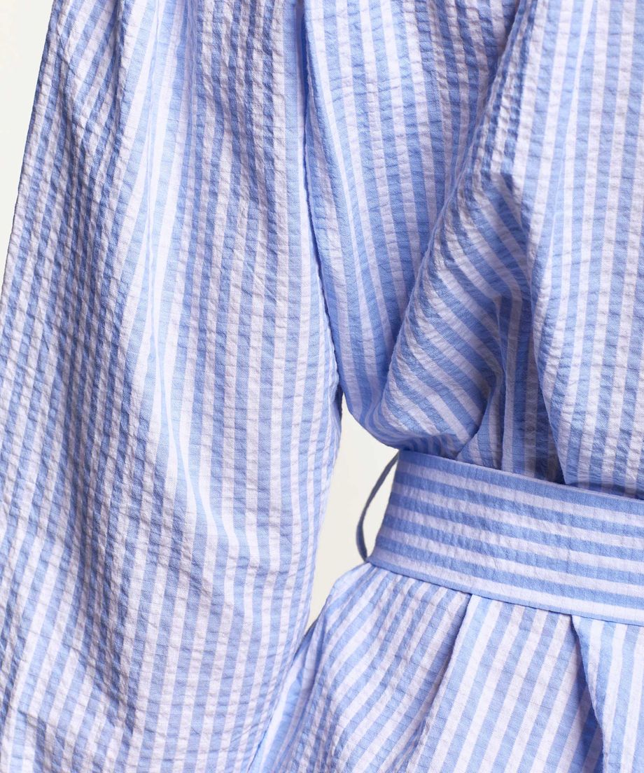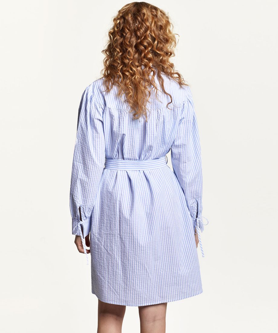 Striped shirt dress.with a voluminous sleeve with wide cuff and tie detail. Hidden button placket at front and tie belt at waist. The dress has gatherings at sleeve and at back, below the yoke. Normal fit100% CottonMachine wash 30 degrees. The model is 176 cm and wears size 36.