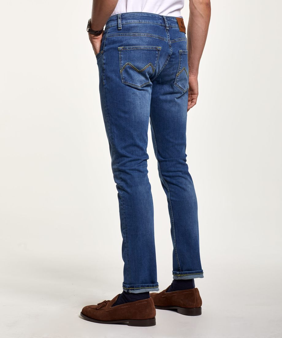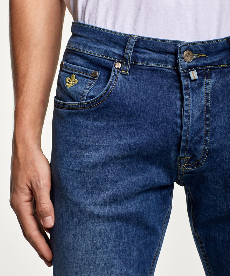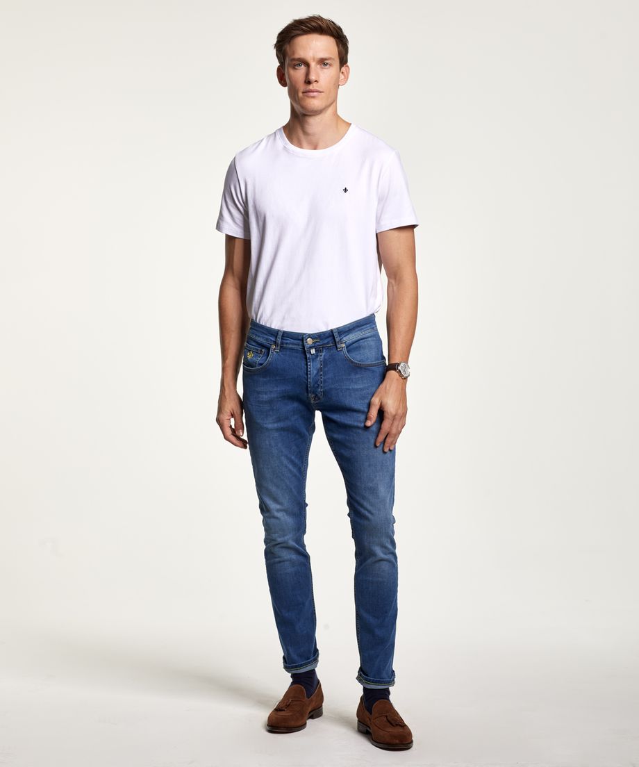 Our popular 5-pocket jeans made of a cotton stretch quality. The jeans close with button and button fly with metal buttons. The back pockets are decorated with signature embroidery. Normal fit. Embroidered lily at coin pocketLeather patch placed at back of waistbandMetal rivetsPrinted pocket lining98% Cotton, 2% ElastaneMachine wash 40 degrees