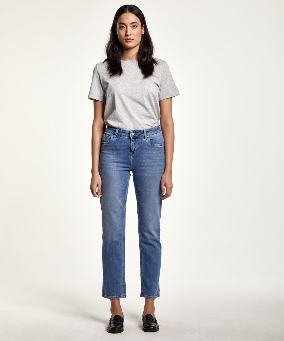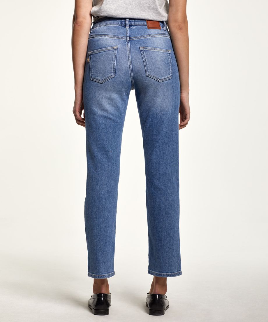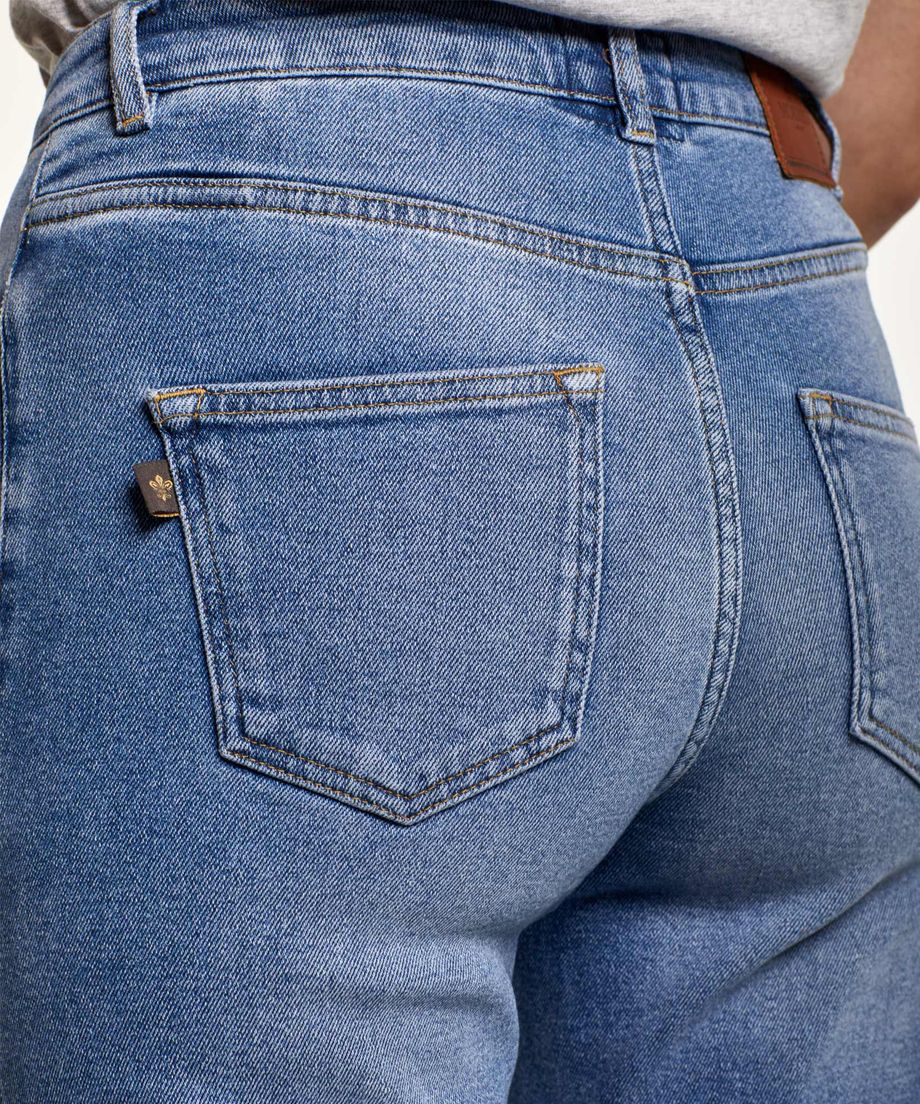 Jeans with high waist, straight and cropped leg. Closes with button and metal zipper. Two pockets and one coin pocket at front, two pockets placed at back. embroidery at coin pocket and leather patch at back of waistbandMachine wash 40 degrees