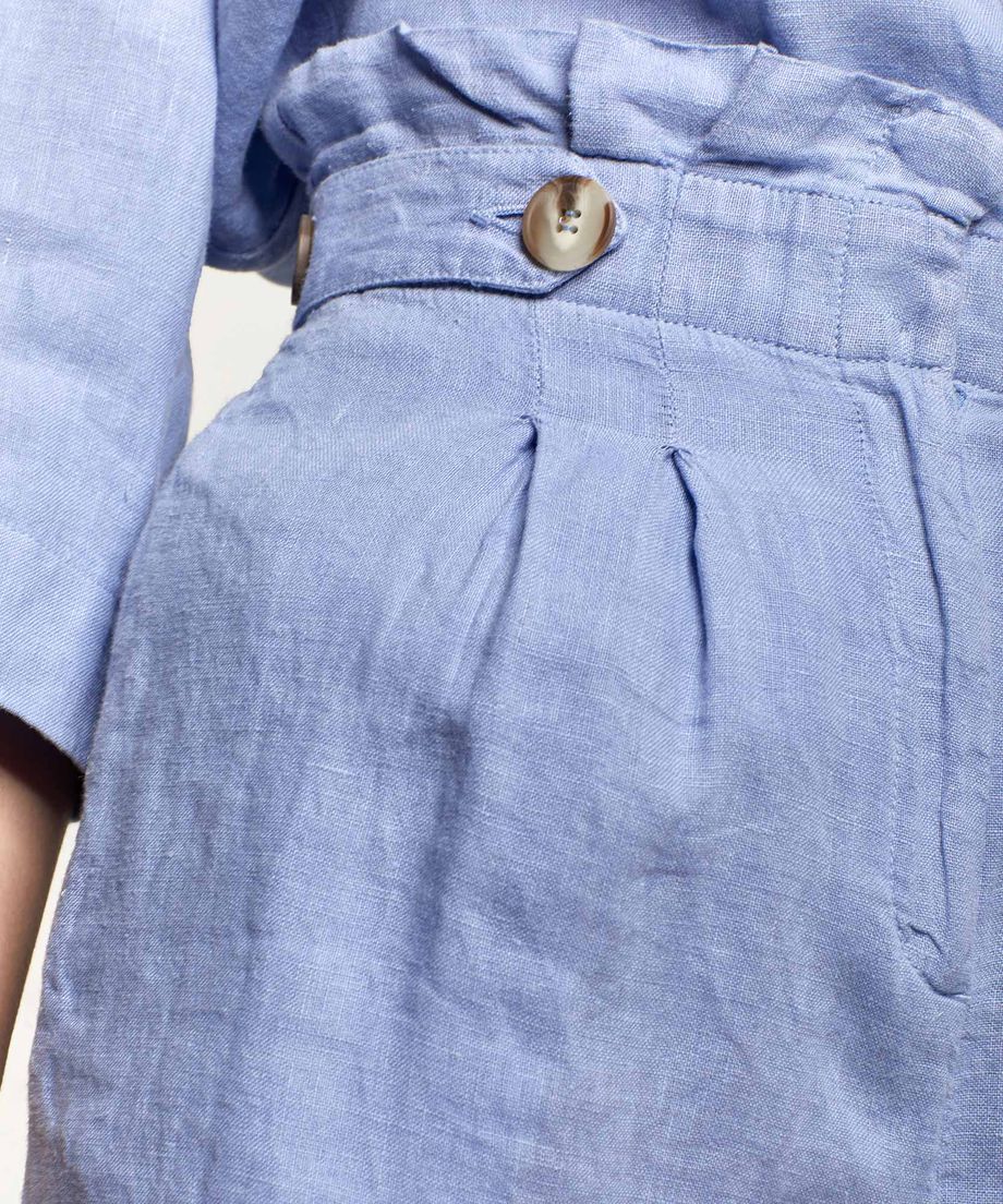 Lady linen shorts with paper bag waist, front pleats and wide flattering leg. Adjustable straps with buttons are placed at waist. The shorts have fabric covered elastic and close with a zipper and front. Normal fit100% Linen. Machine wash 30 degrees