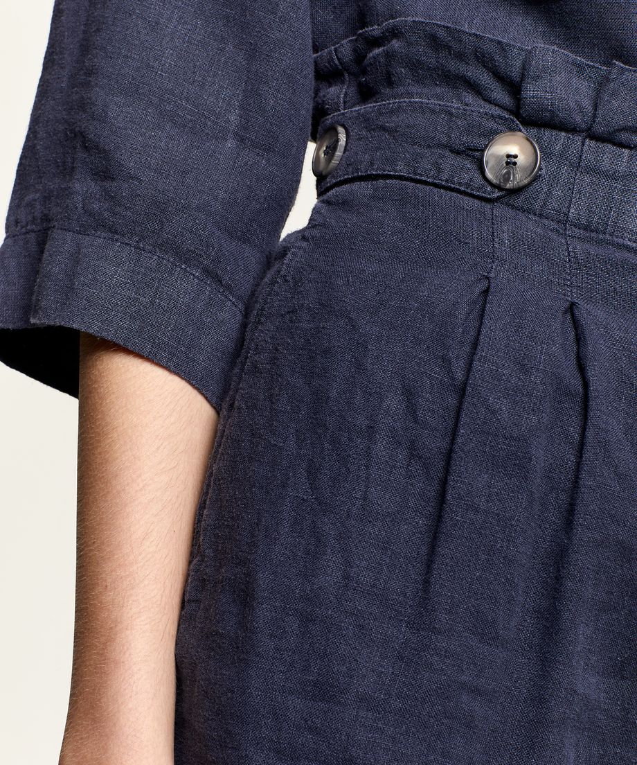 Lady linen shorts with paper bag waist, front pleats and wide flattering leg. Adjustable straps with buttons are placed at waist. The shorts have fabric covered elastic and close with a zipper and front. Normal fit100% Linen. Machine wash 30 degrees