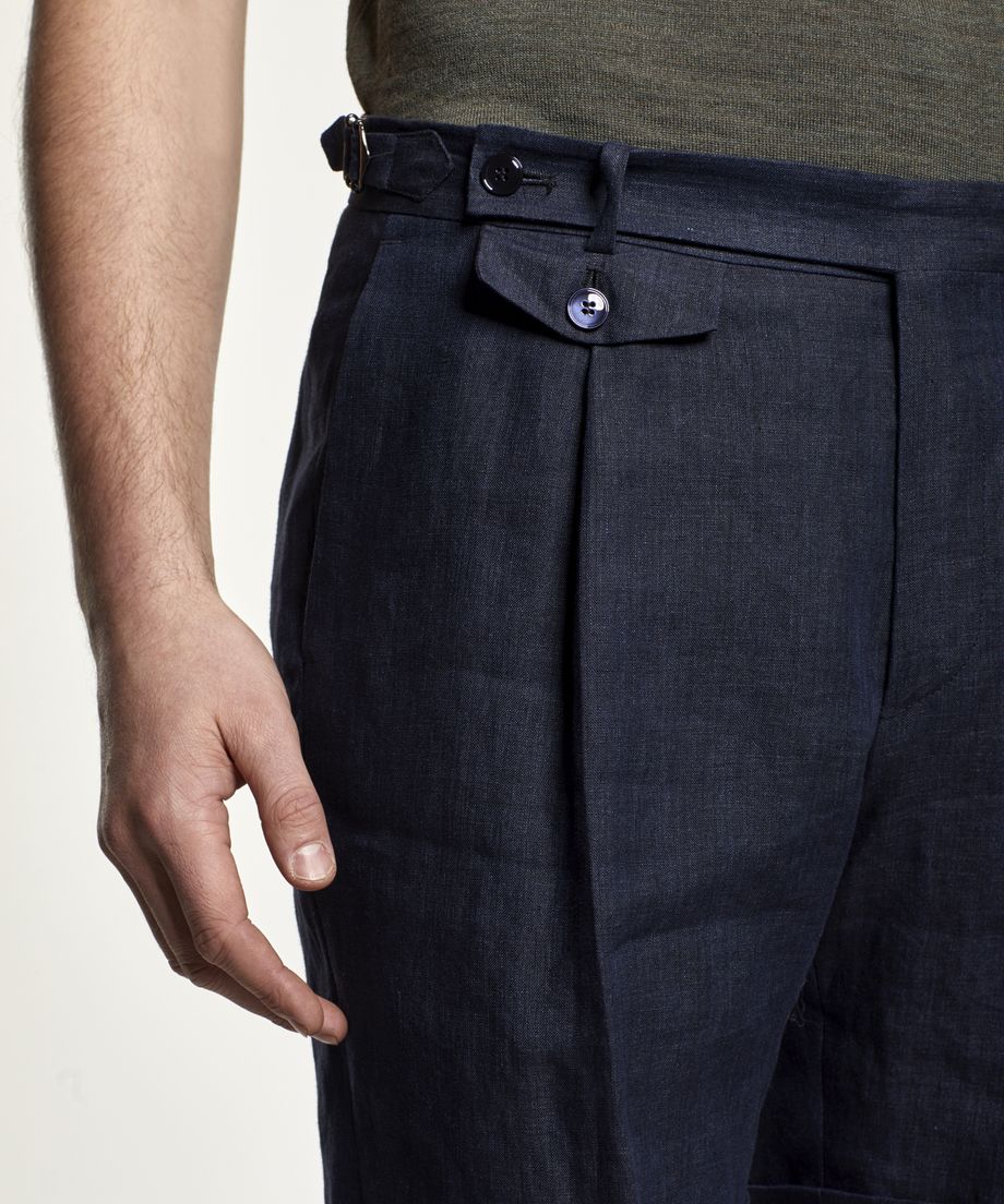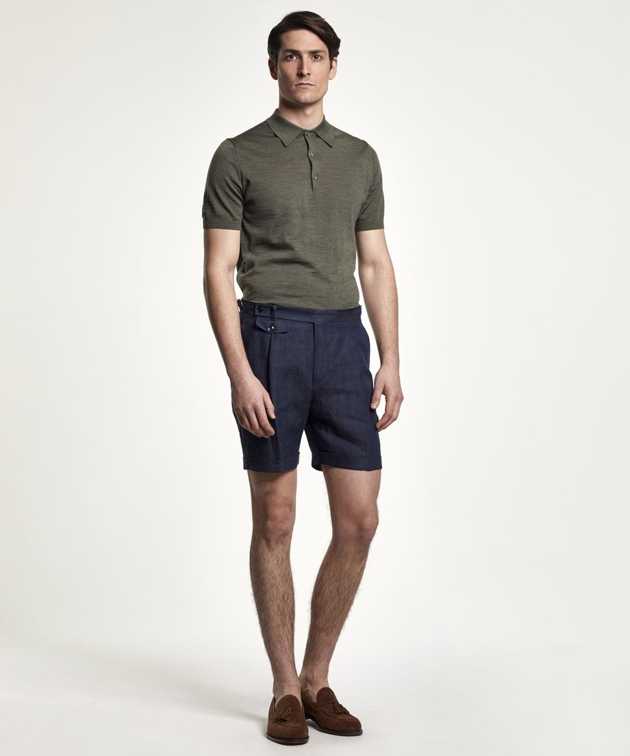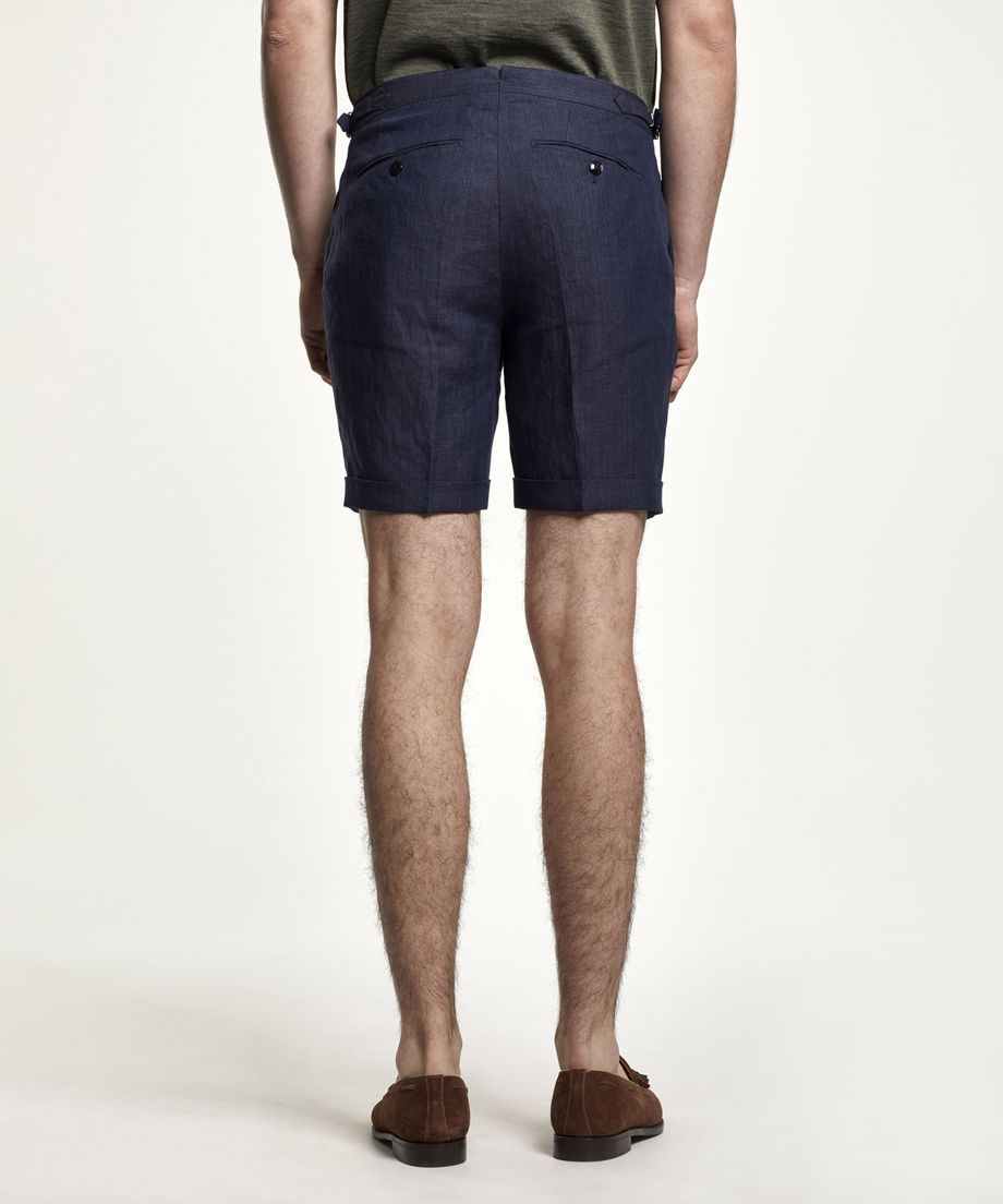 Premium linen shorts with a dressed look, made of a fabric signed by the Italian weaver Angelico. The shorts have a slightly higher waist, front pleats and side adjusters at waist. Closes with a button, hidden hook and eye and zip fly. Two slanted pockets and one coin pocket are placed at front. Two jetted pockets at back with button through. Normal fit100% LinenDry cleanThe model is 190 cm and wears size 48.