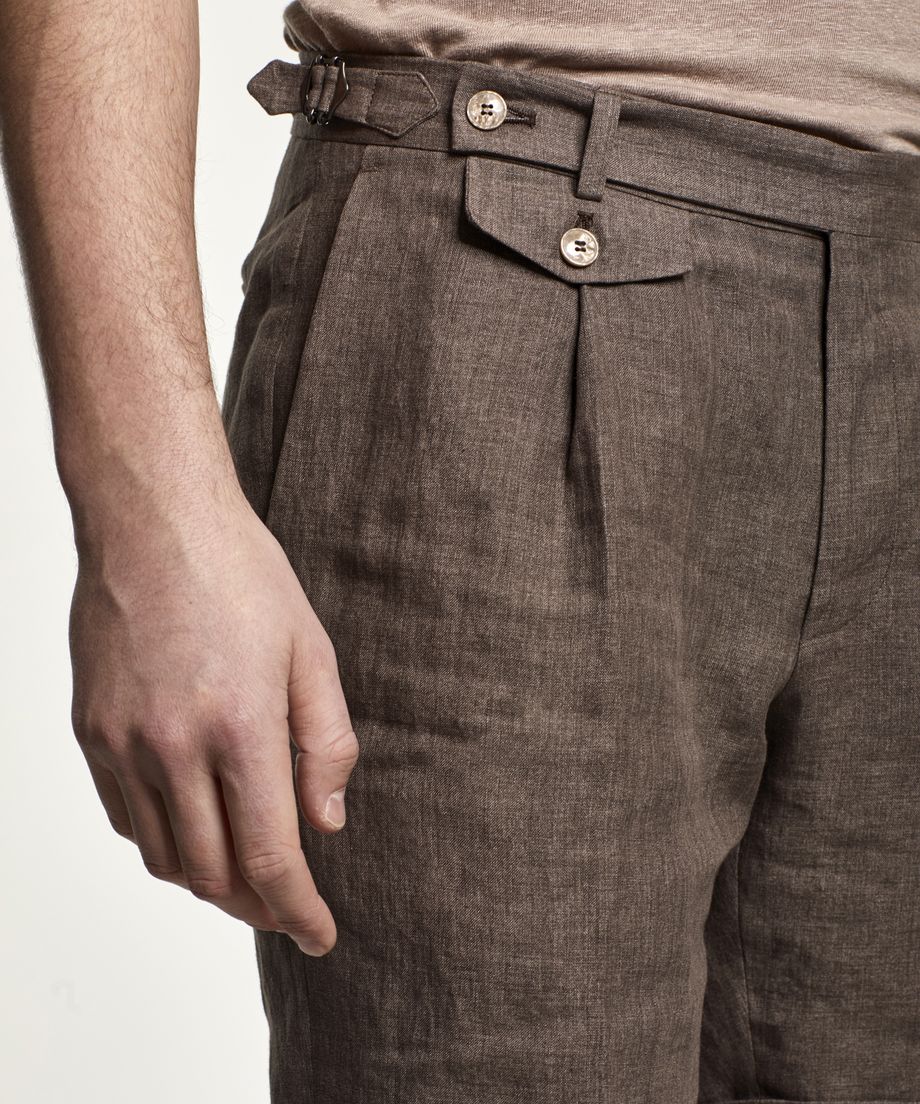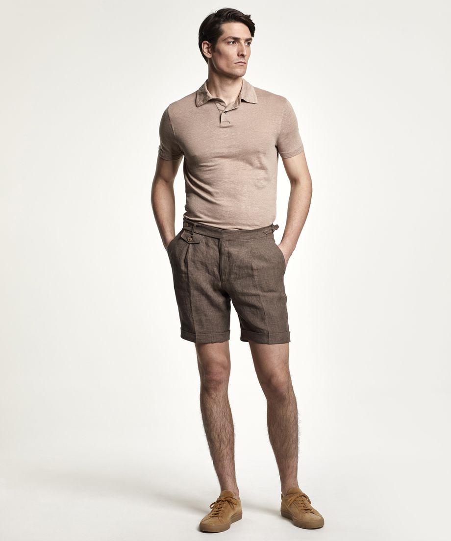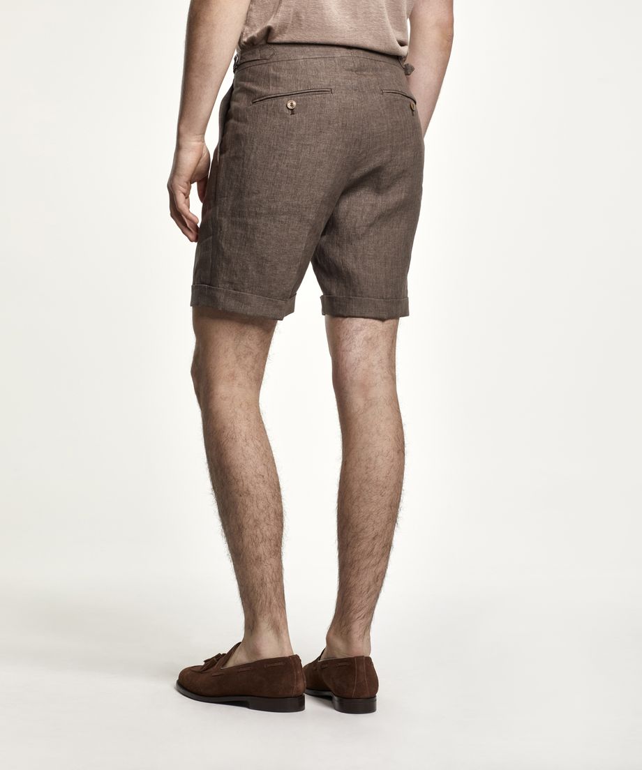 Premium linen shorts with a dressed look, made of a fabric signed by the Italian weaver Angelico. The shorts have a slightly higher waist, front pleats and side adjusters at waist. Closes with a button, hidden hook and eye and zip fly. Two slanted pockets and one coin pocket are placed at front. Two jetted pockets at back with button through. Normal fit100% LinenDry cleanThe model is 190 cm and wears size 48.