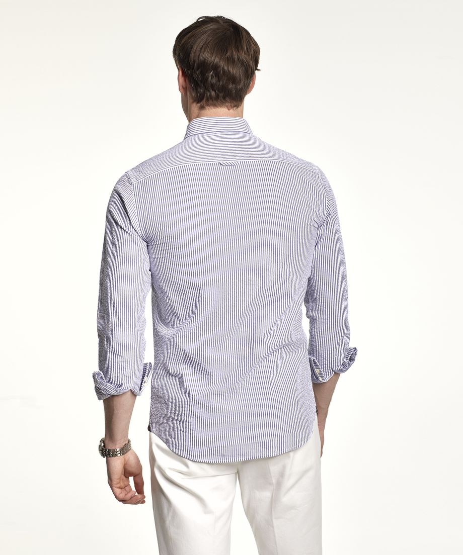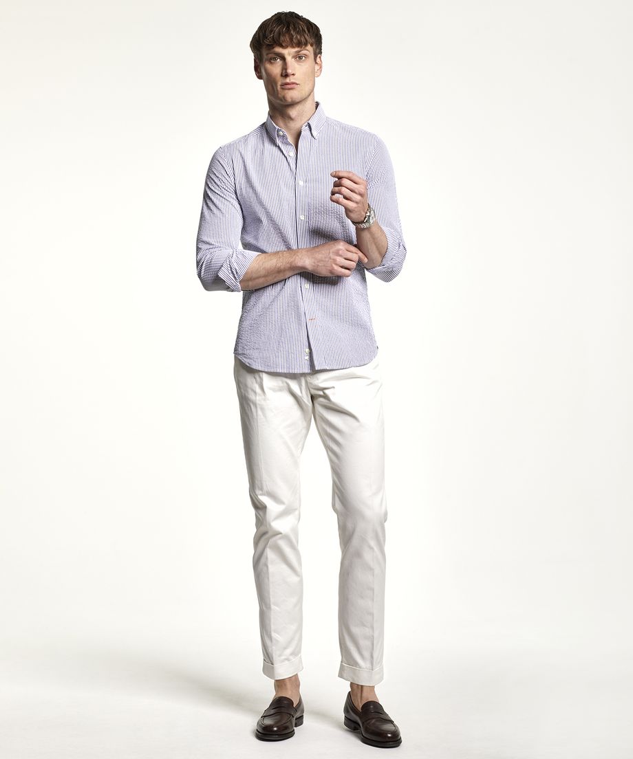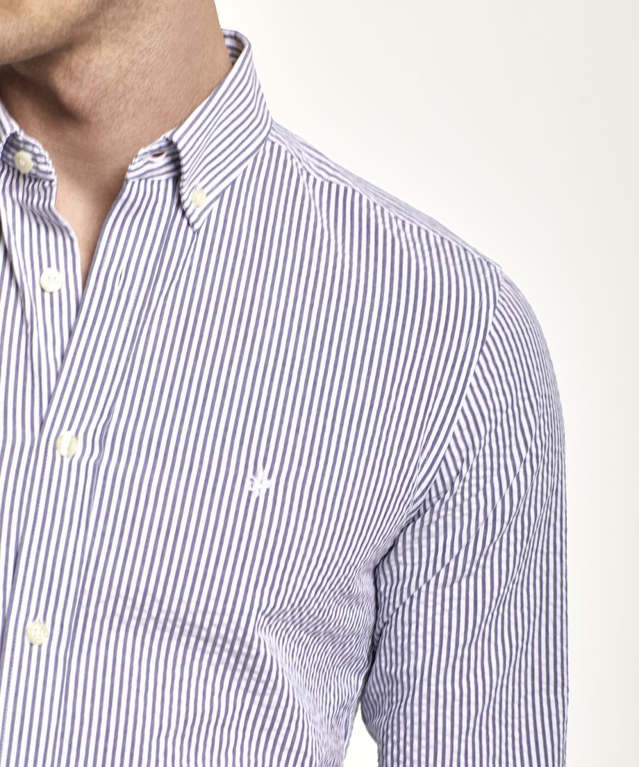 The perfect shirt for spring and summer in classic seersucker with stripes and a timeless solid white colour. The shirt has a button down collar, long sleeve and single cuff slightly rounded with two buttons. Regular fitEmbroidered lily at left chest100% CottonMachine wash 30 degrees
