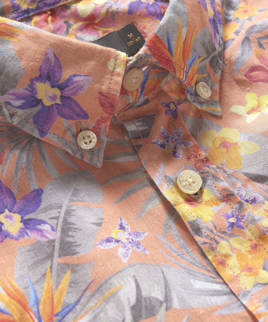 Linen shirt with a colourful and tropical print. The shirt has button down collar and long sleeve. Single cuff slightly rounded with two buttons.Regular fitEmbroidered lily at left chest100% Linen. Machine wash 30 degrees